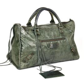 Pelle di un bel verde cupo, con dettagli metallici in color oro brunito. Modello ormai iconico con il caratteristico specchietto esterno.