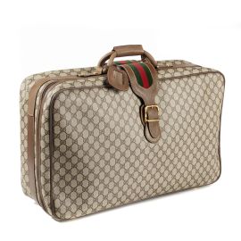 Edizione risalente agli anni '70 di valigia semirigida in tessuto GG spalmato beige/marrone, con fasce laterali e manigliotto in pelle marrone chiaro. Fascia in nastro verde/rosso/verde su parte con chiusura frontale. Metalleria in ottone color oro. Interno in cotone con doppia cinghia logata. Corredato di chiavi e porta indirizzi originali.