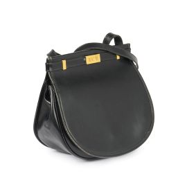 In resistente pelle nera, a forma di bisaccia con metalleria color oro; interno in scamosciato cammello con una tasca con zip. Comodissima per uso quotidiano.