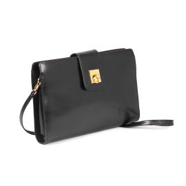 Per completare un look super vintage, tracolla in pelle nera con interno a tre soffietti di cui uno chiuso con zip; metalleria in ottone. Tracolla staccabile per permettere l'indosso come pochette.
