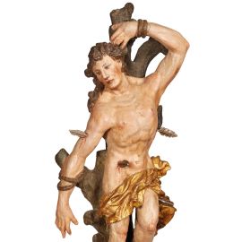 scultura processionale in legno policromo e dorato, raffigurante il santo con il braccio sinistro alzato sopra la testa e il destro lungo il fianco, entrambi legati al tronco alle sue spalle da una corda, vestito solo del perizoma dorato e trafitto da frecce, su base in legno scolpito a foglie d'acanto e dorato, cm 81x25x17,5
