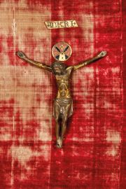 figura in bronzo dorato con aureola e cartiglio decorati in smalti policromi; Cristo cm 15x13,5
