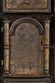in legno ebanizzato con placche in metallo inciso, fronte centrato da sportellino centinato affiancato da colonne, apribile a celare pianetto inferiore a scacchiera, tutto intorno dieci cassetti centrati da placche in metallo inciso raffigurano scene di paesaggi profilati da intaglio guilloché, su piedini a sfera schiacciata, cm 44x52,5x31,5