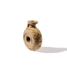 Piccolo aryballos a ciambella realizzato in argilla depurata con orlo a cerchiello piatto e piccola ansa innestata verticalmente tra orlo e spalla. Caratterizzato da decorazioni incise e a vernice nera.