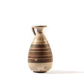 Piccolo aryballos a ciambella realizzato in argilla depurata con orlo a cerchiello piatto e piccola ansa innestata verticalmente tra orlo e spalla. Caratterizzato da decorazioni incise e a vernice nera.