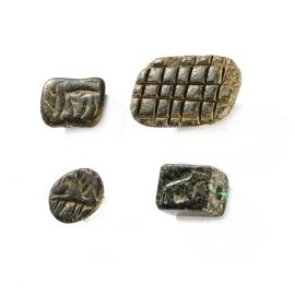 Gruppo composto da quattro palcche-sigillo in pietra dotate di fori passanti. Le caratteristiche decorazioni sono realizzate ad incisione.