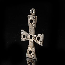 Bellissima croce caratterizzata da quattro lunghe braccia con decorazioni rese ad incisioni superficial circolari. Le cinque più profonde, presenti in specifici punti, simboleggerebbero le "ferite di Cristo" sulla croce. Verosimilmente completate (in origine) da castoni. Presenta anello di sospensione.