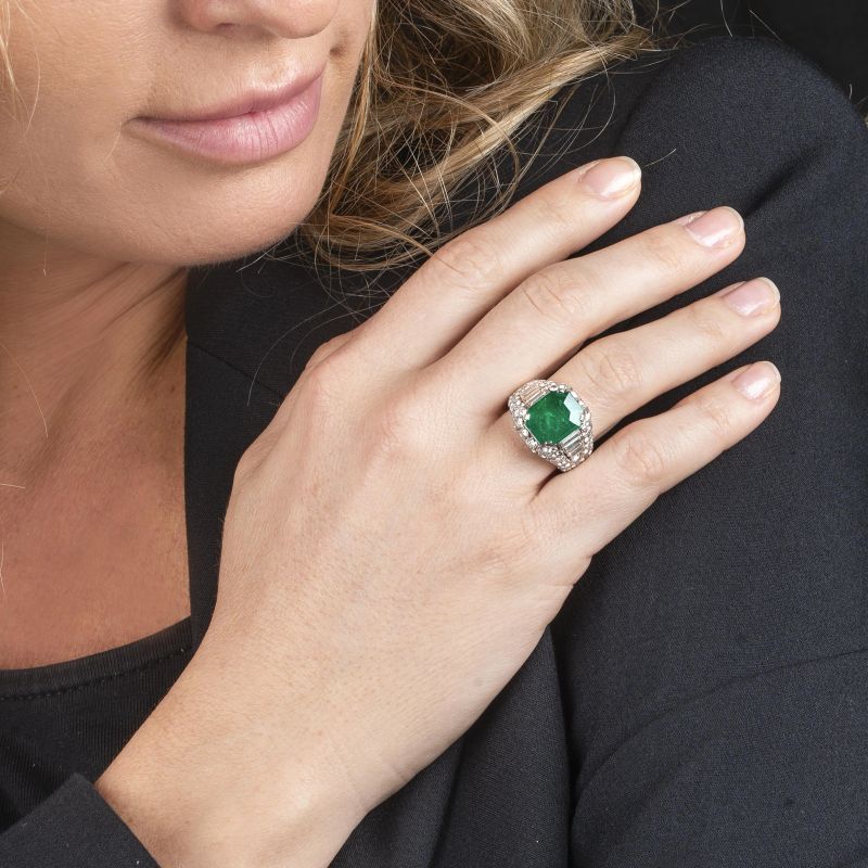 in oro bianco 18kt, al centro uno smeraldo taglio ottagonale di ct. 4 circa, circondato da diamanti taglio brillante e baguette per ct. 4 circa, mis. 12/52, gr. 15