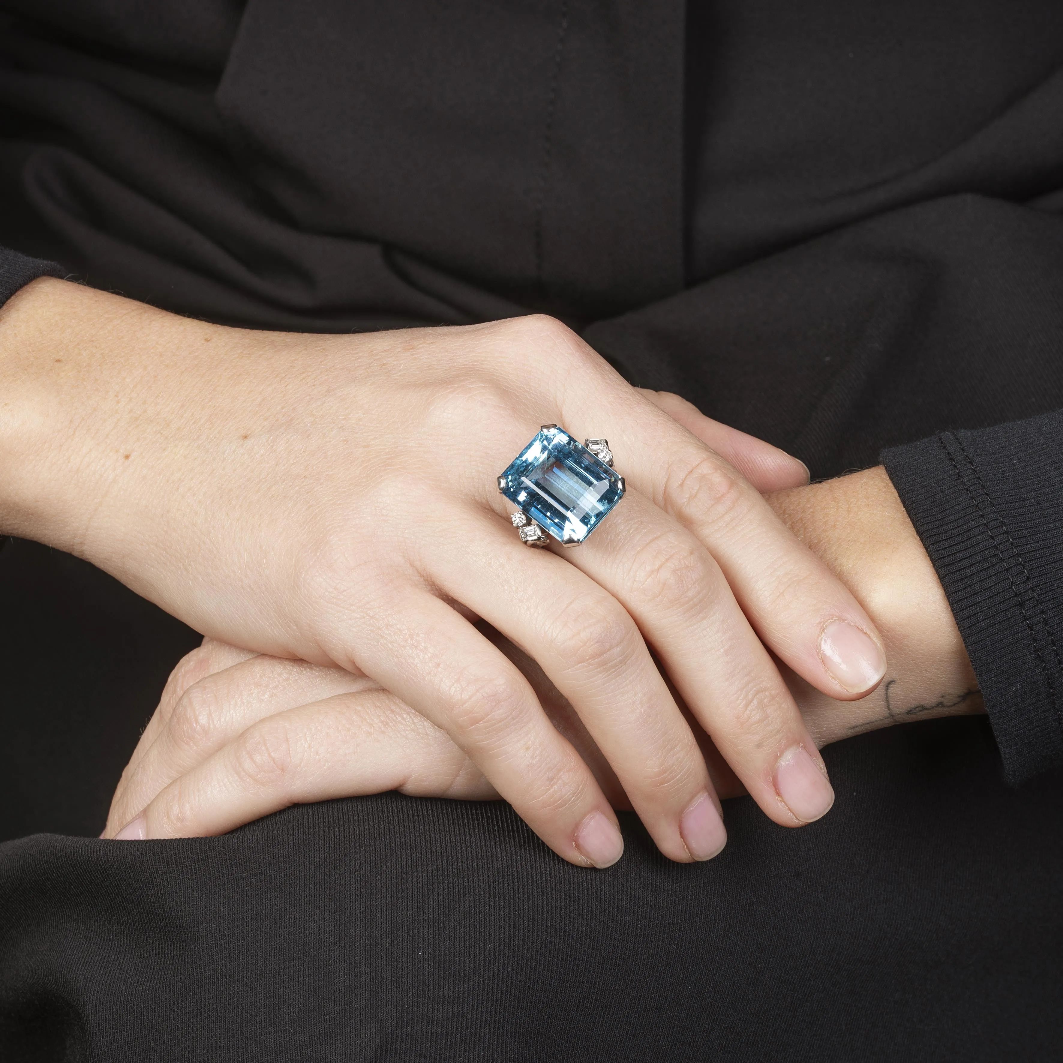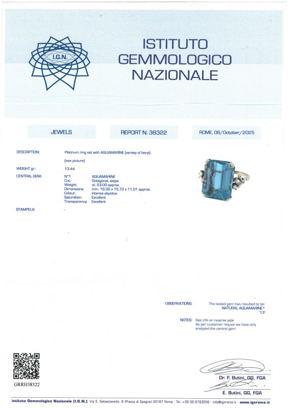 in platino, al centro un'acquamarina taglio ottagonale di ct. 23 circa, con diamanti taglio brillante e baguette ct. 0.30 mis.16/56, gr. 13. Corredato di certificato IGN del 08/10/2025