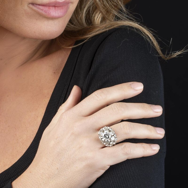 in oro bianco 18kt, al centro un diamante taglio brillante di ct. 2.20 circa (difetti), circondato da diamanti taglio brillante per ct 6.50 circa, punzone 750, mis. 20/60 , gr. 8