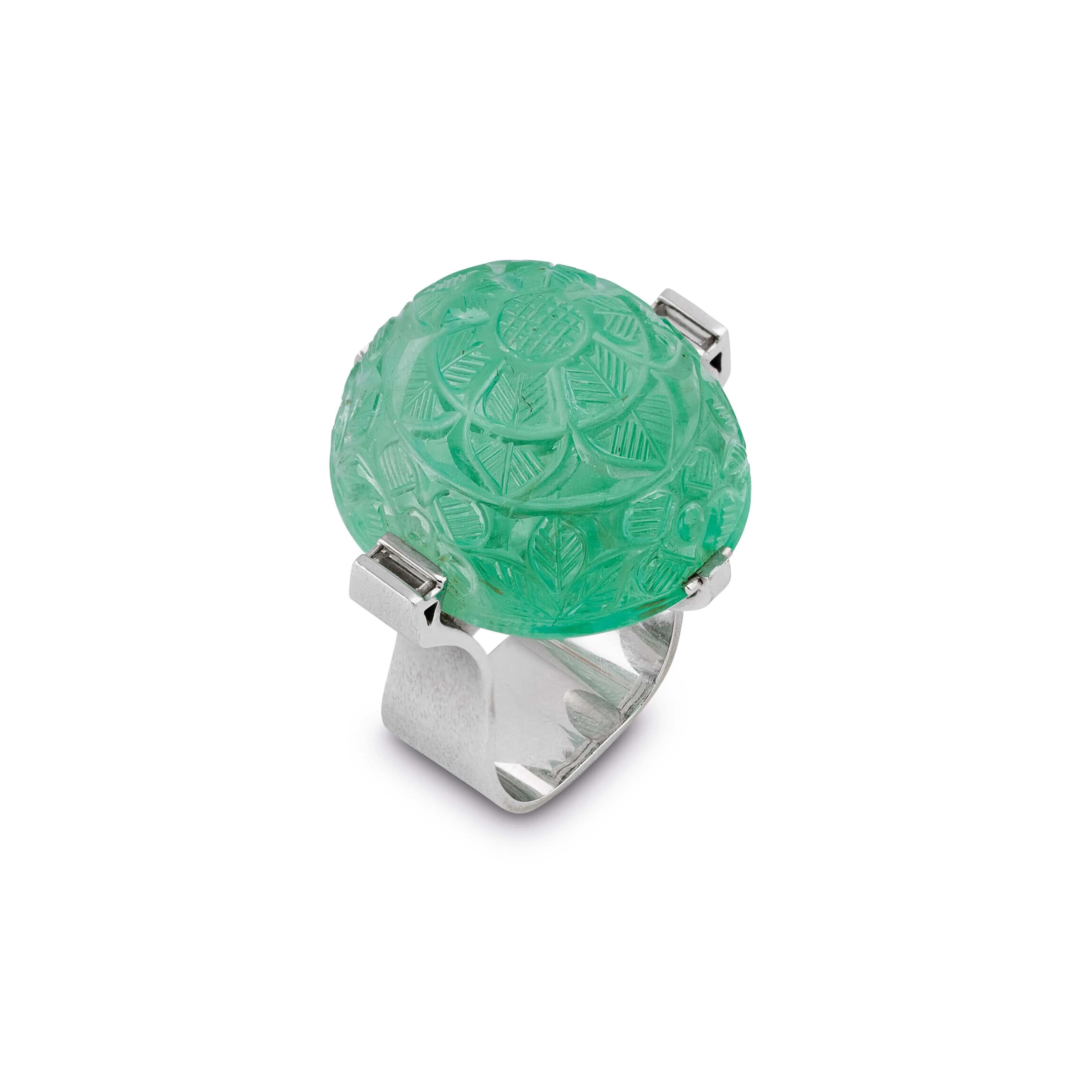 ANELLO CON SMERALDO INCISOin oro bianco satinato 18kt, al centro uno smeraldo taglio ovale ct. 35 circa inciso con motivi floreali, punzone 750, mis 12/52 gr. 24