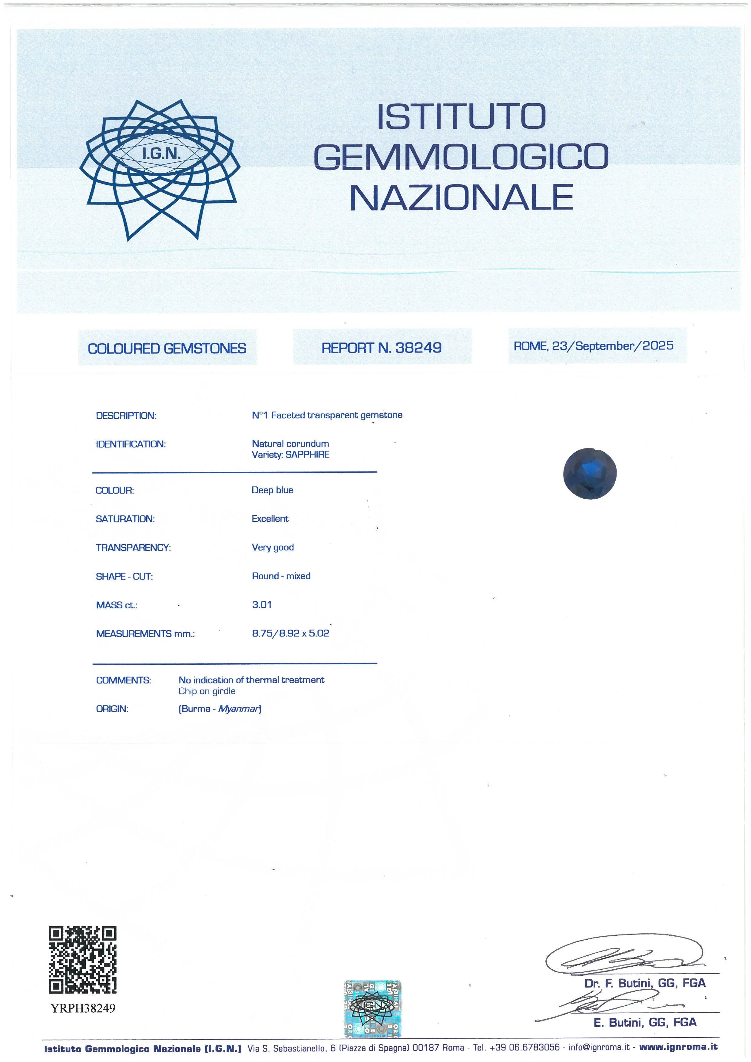 in platino, impreziosito al centro da un diamante taglio brillante di ct. 2.15, colore G, purezza Vvs2 e da uno zaffiro birmano di ct. 3.01, diamanti taglio baguette digradanti sulla montatura (due mancanti) per ct. 0.70 circa, punzone pt e del fabbricante, mis. 12/52, gr. 7. Corredato di certificati IGN del 23/09/2025 attestanti le caratteristiche del brillante e dello zaffiro.