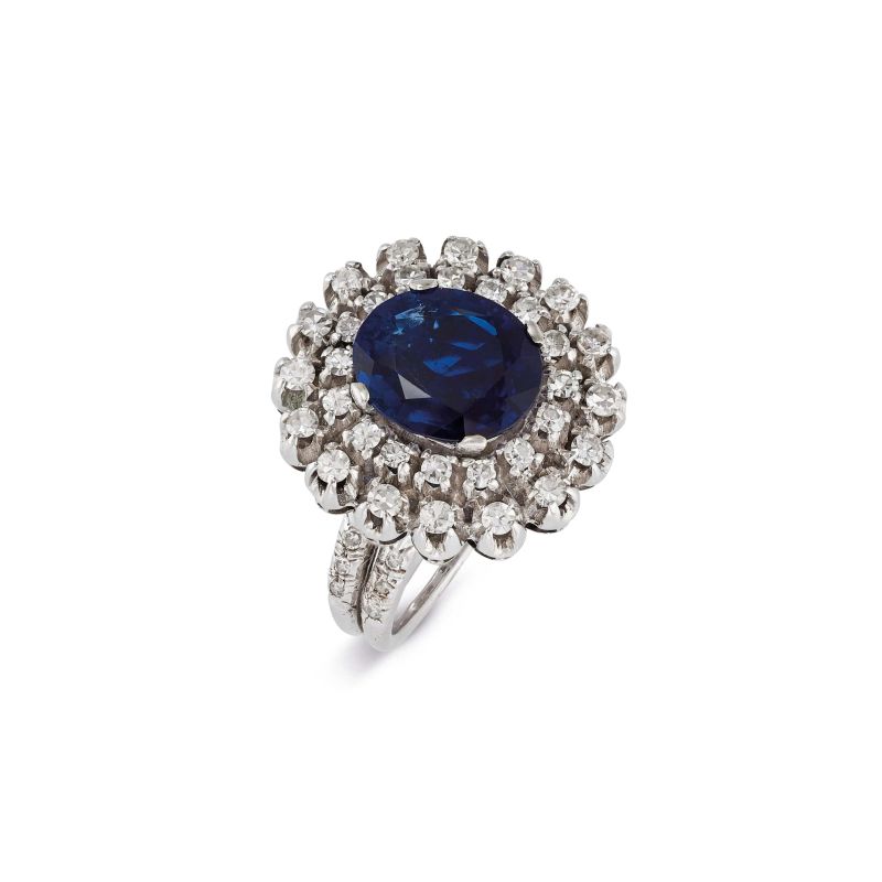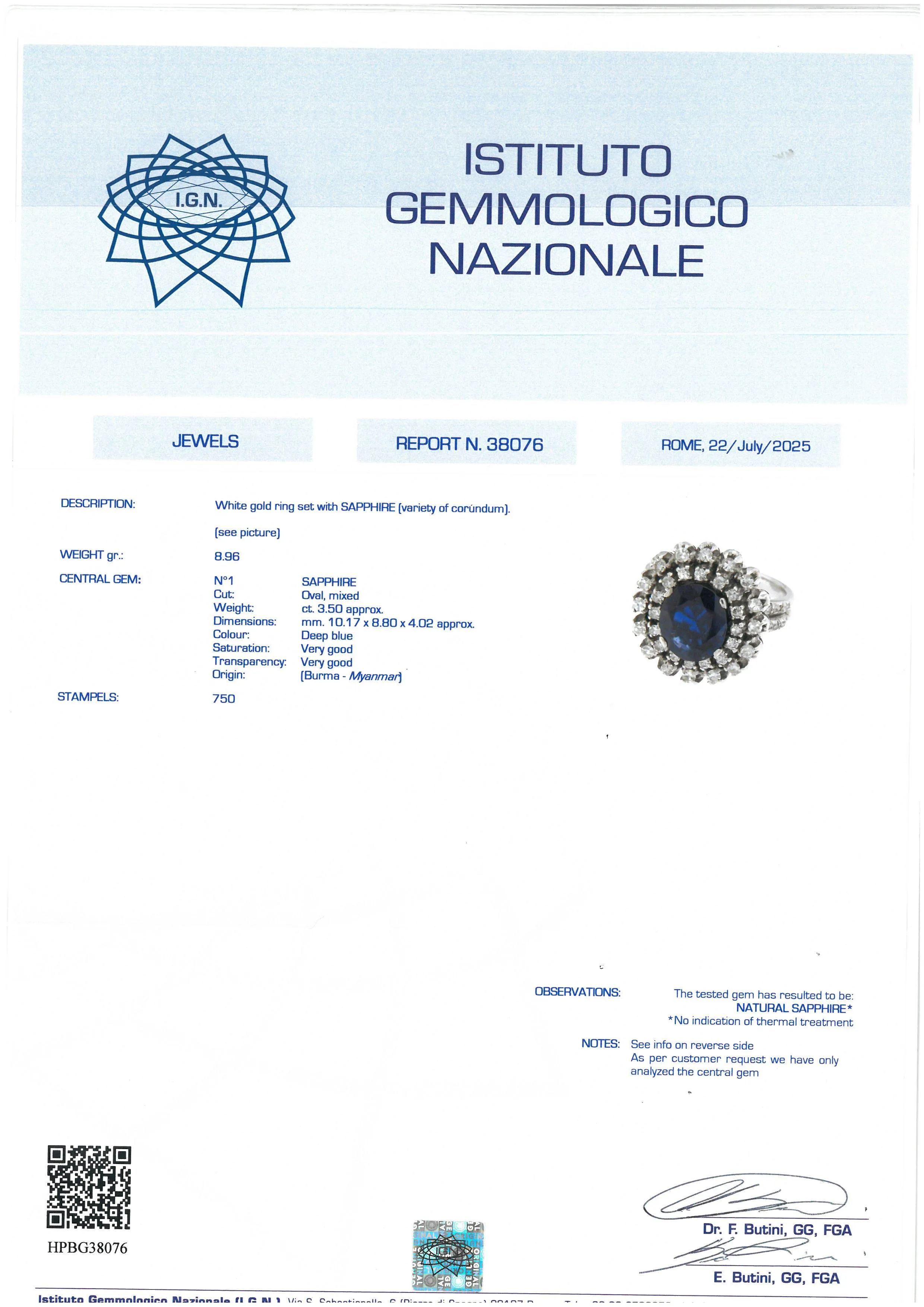 in oro bianco 18kt, impreziosito al centro da uno zaffiro birmano taglio ovale di ct 3.50 circa, circondato da una doppia fila di diamanti taglio huit huit per ct 0.80 circa, punzone 750, mis. 12/52, gr. 8. Corredato di certificato IGN del 22/07/2025 attestante la natura dello zaffiro e l'assenza di trattamenti termici.