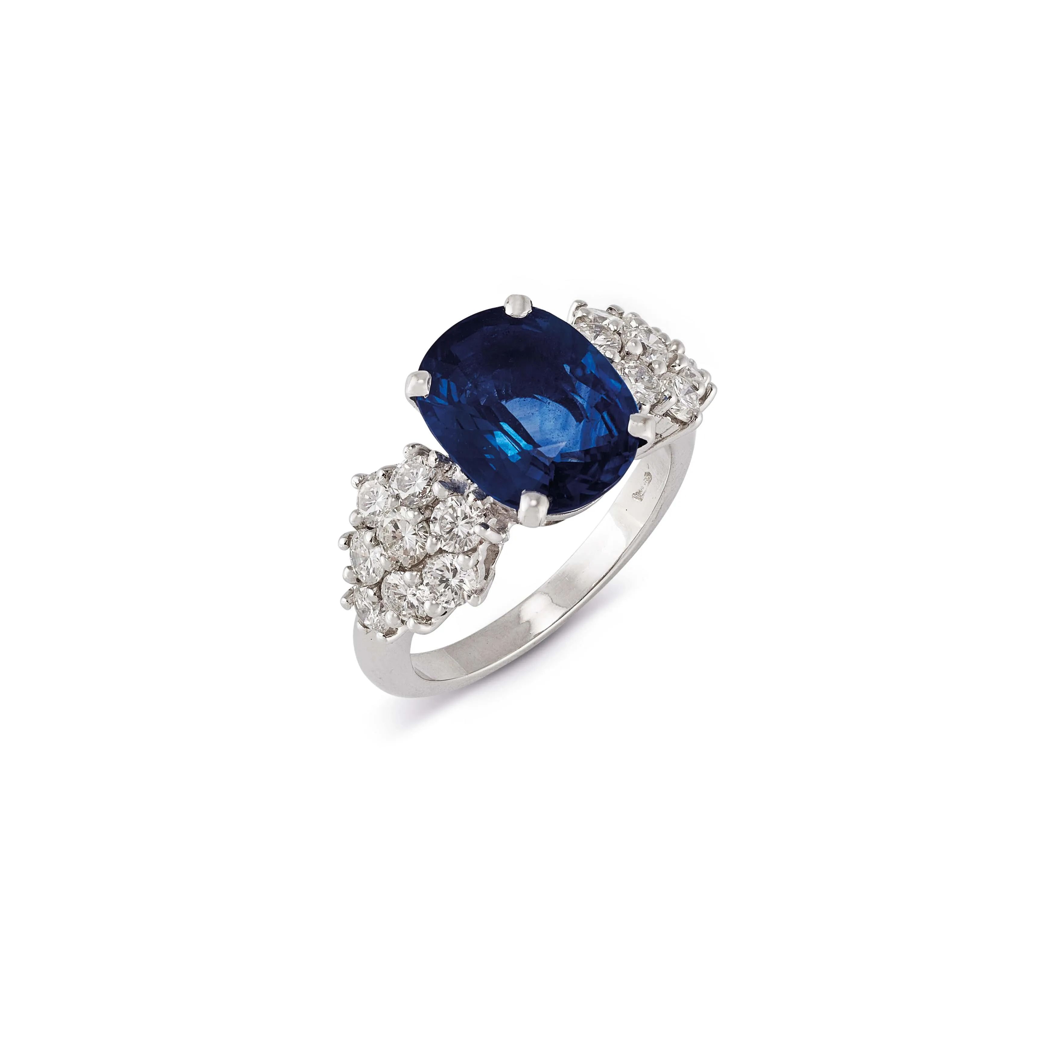 in oro bianco 18kt, al centro uno zaffiro taglio cuscino di ct.4.50 circa, affiancato da diamanti taglio brillante per ct.1.30 circa, punzoni 750 e del fabbricante, mis. 13/53, gr. 6