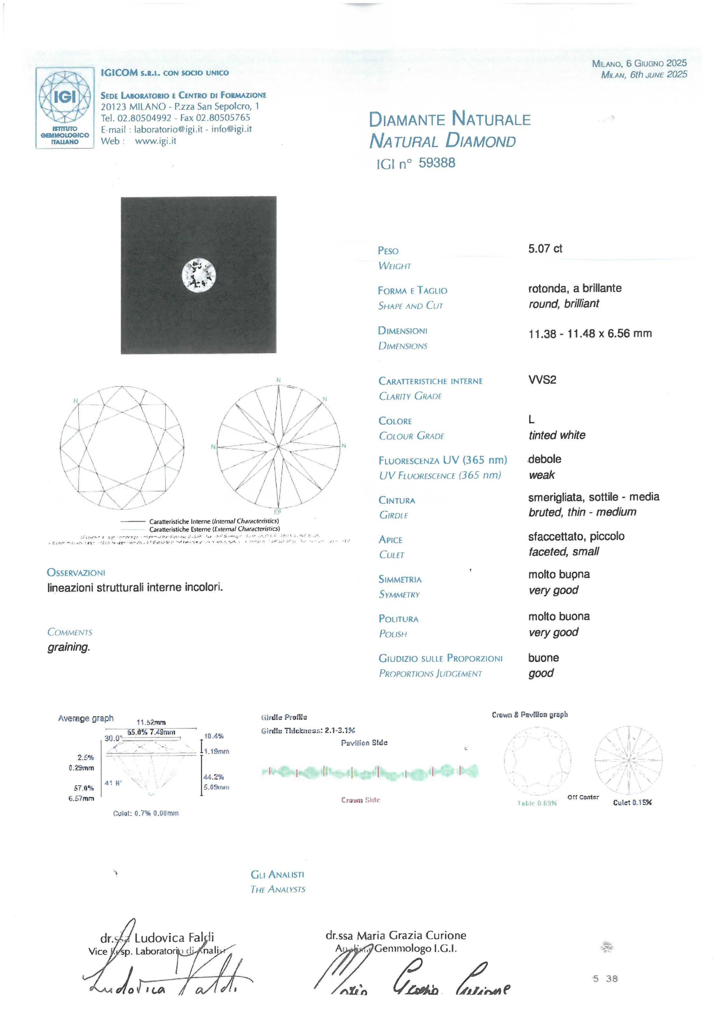 in oro bianco 18kt, diamante taglio brillante di ct. 5,07, colore L, purezza Vvs2, mis. 12/52, gr. 5. Corredato di certificato IGI del 06/06/2025 attestante le caratteristiche