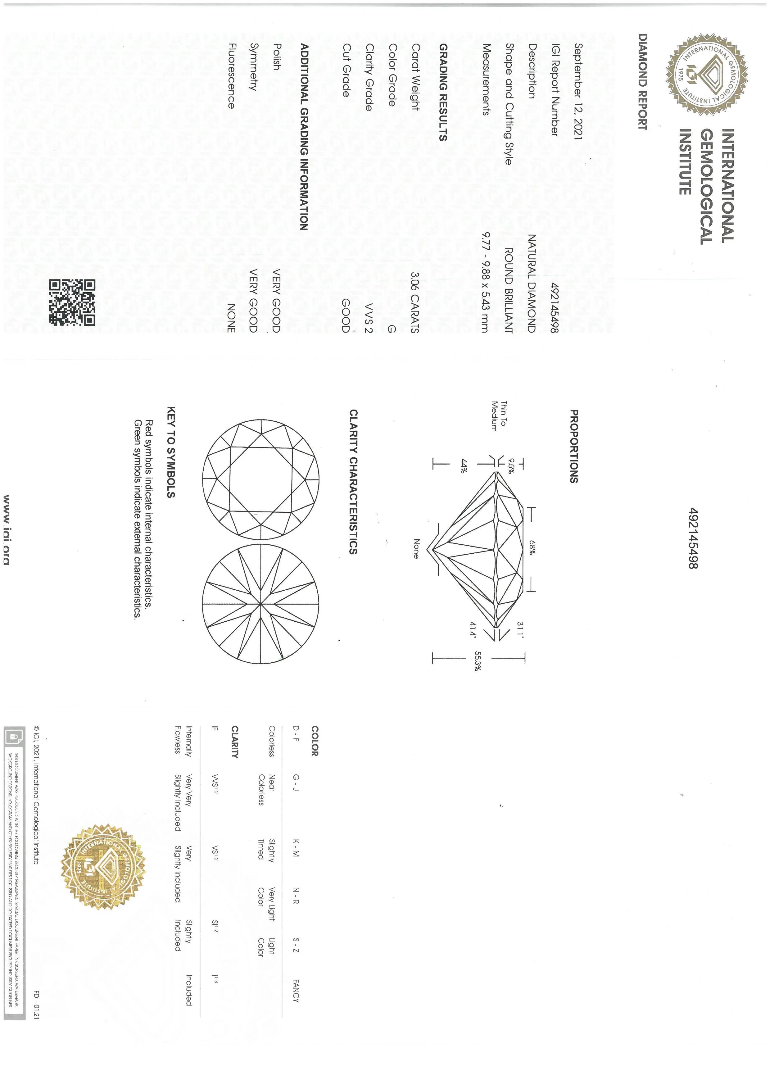 in oro bianco 18kt, diamante taglio brillante di ct. 3.06, colore G, purezza Vvs2, punzone 750, mis. 13/53, gr. 4. Corredato di certificato IGI del 12/09/2021 attestante le caratteristiche.