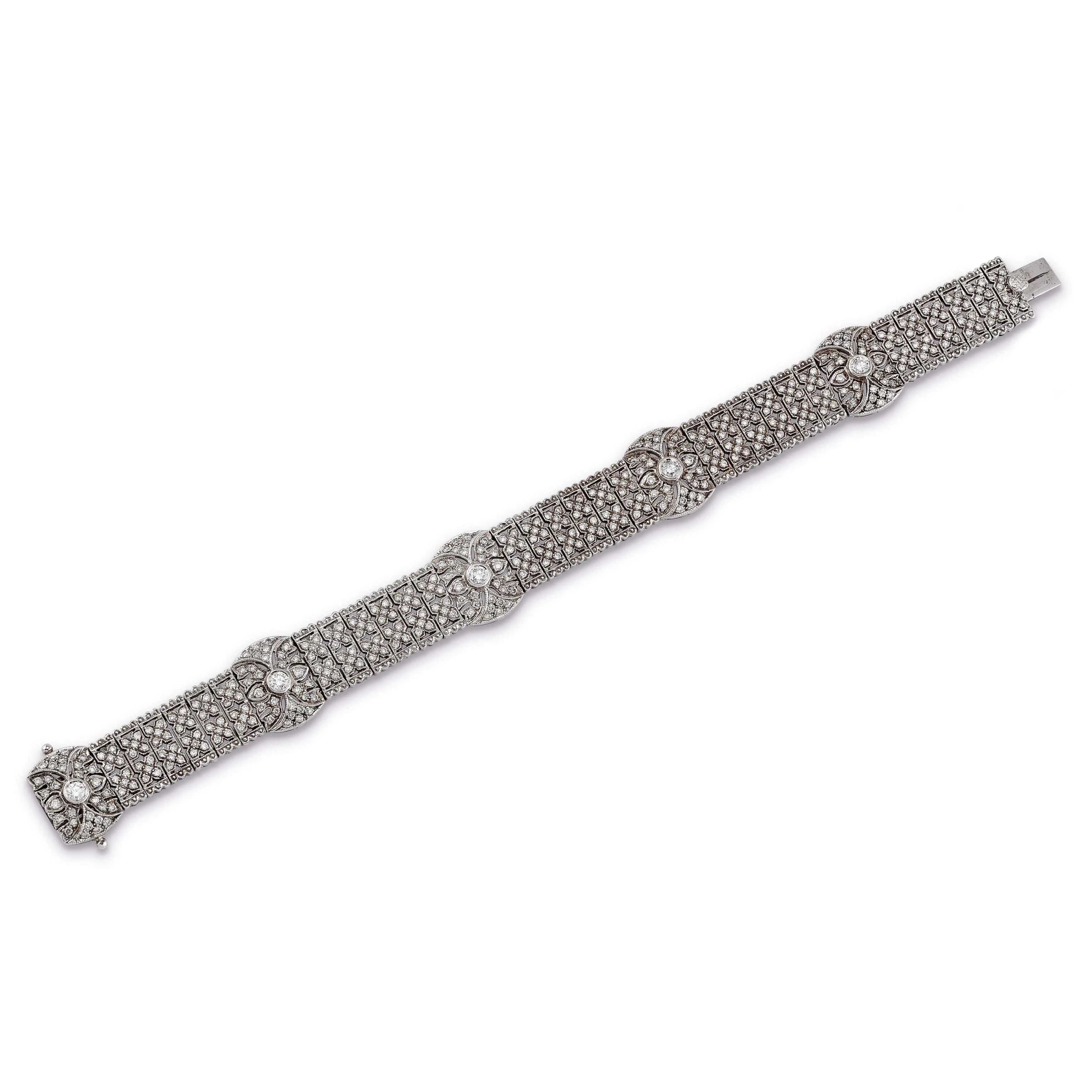 in oro bianco 18kt, traforato a motivo floreale, con diamanti taglio brillante per ct. 5 circa, punzone 750, lungh. cm 18.8, gr. 35