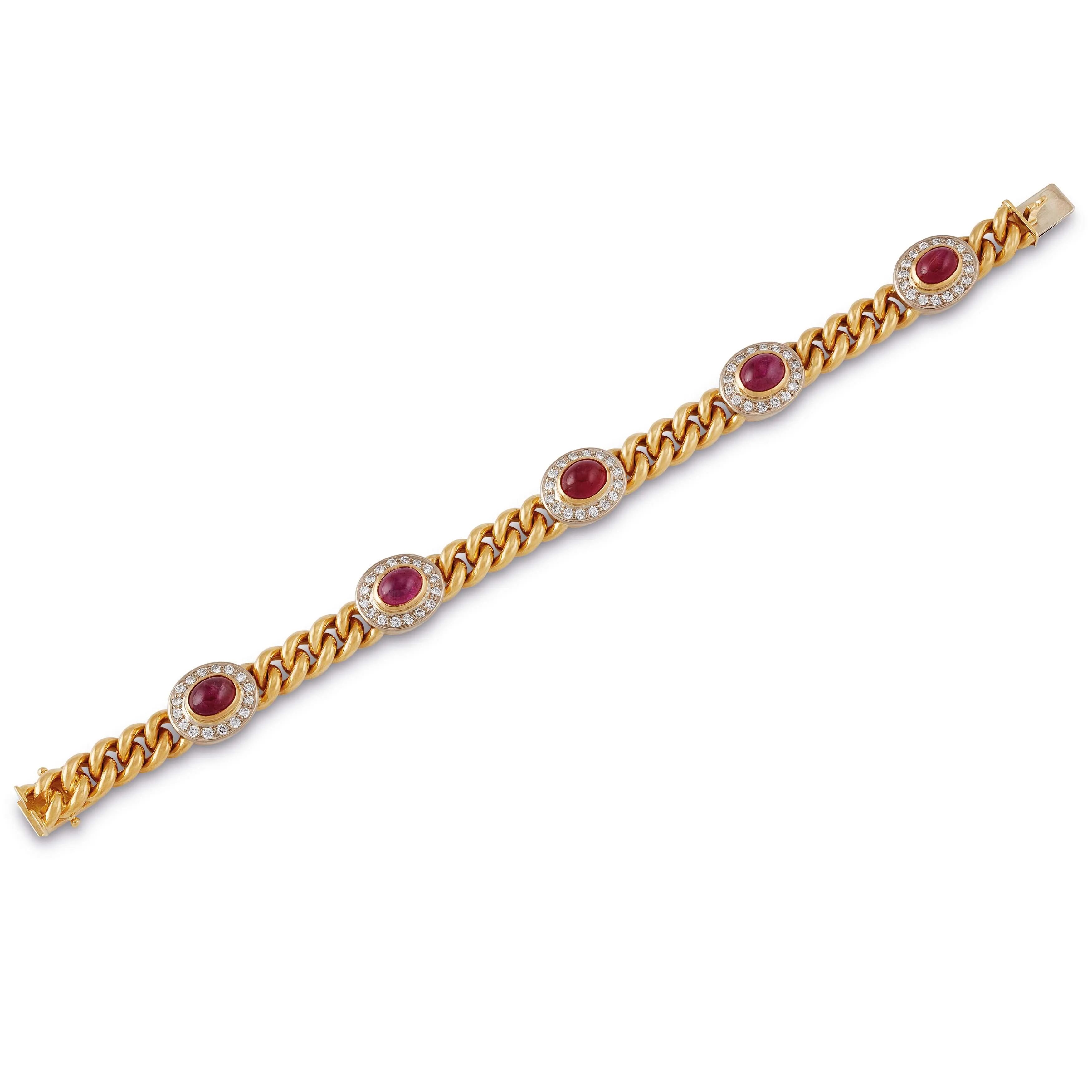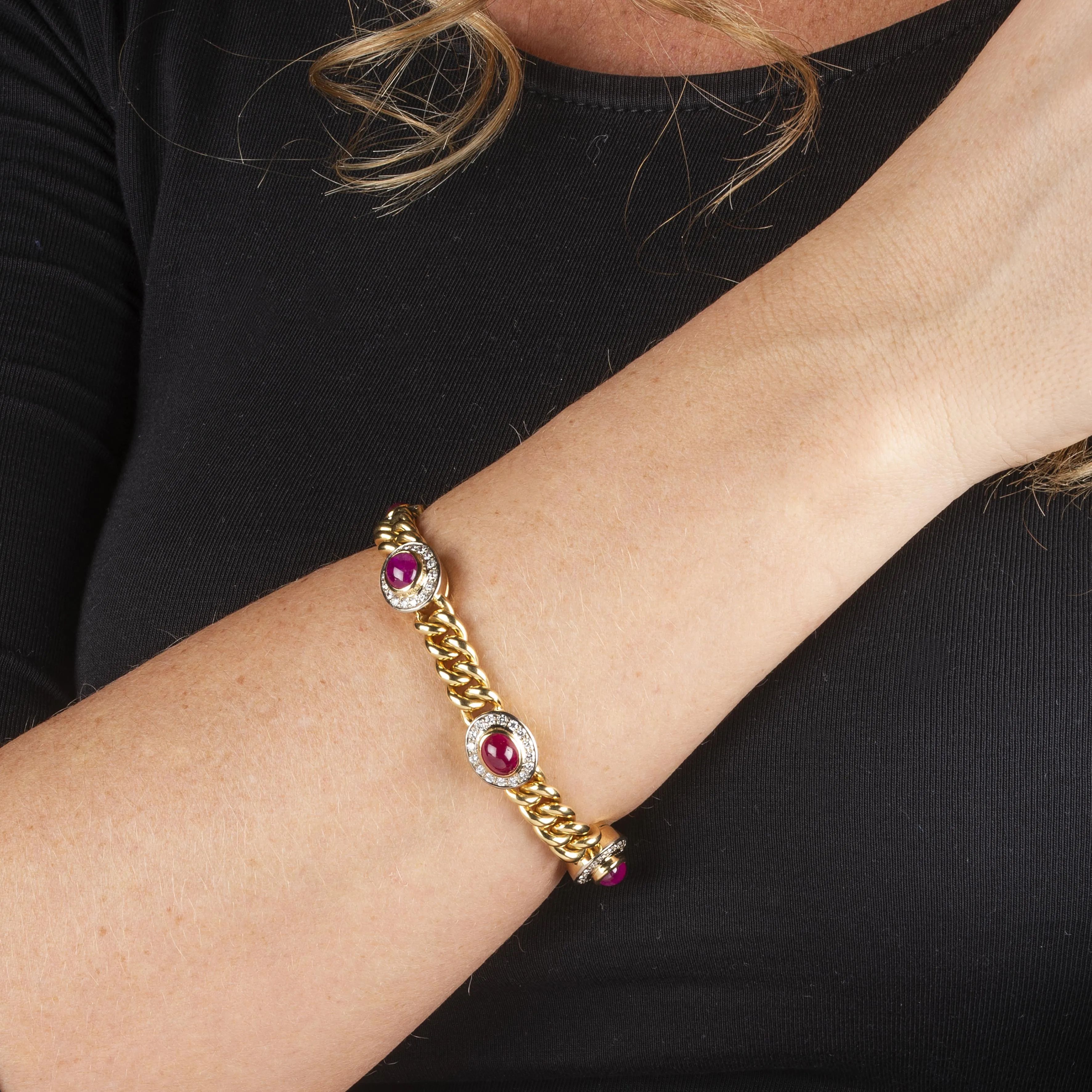 in oro giallo 18kt, maglia groumette intervallata da cinque elementi impreziositi da rubini cabochon per ct. 8 circa e diamanti taglio brillante per ct. 1.60, punzone 750, lungh. cm 18.7, gr. 58 circa