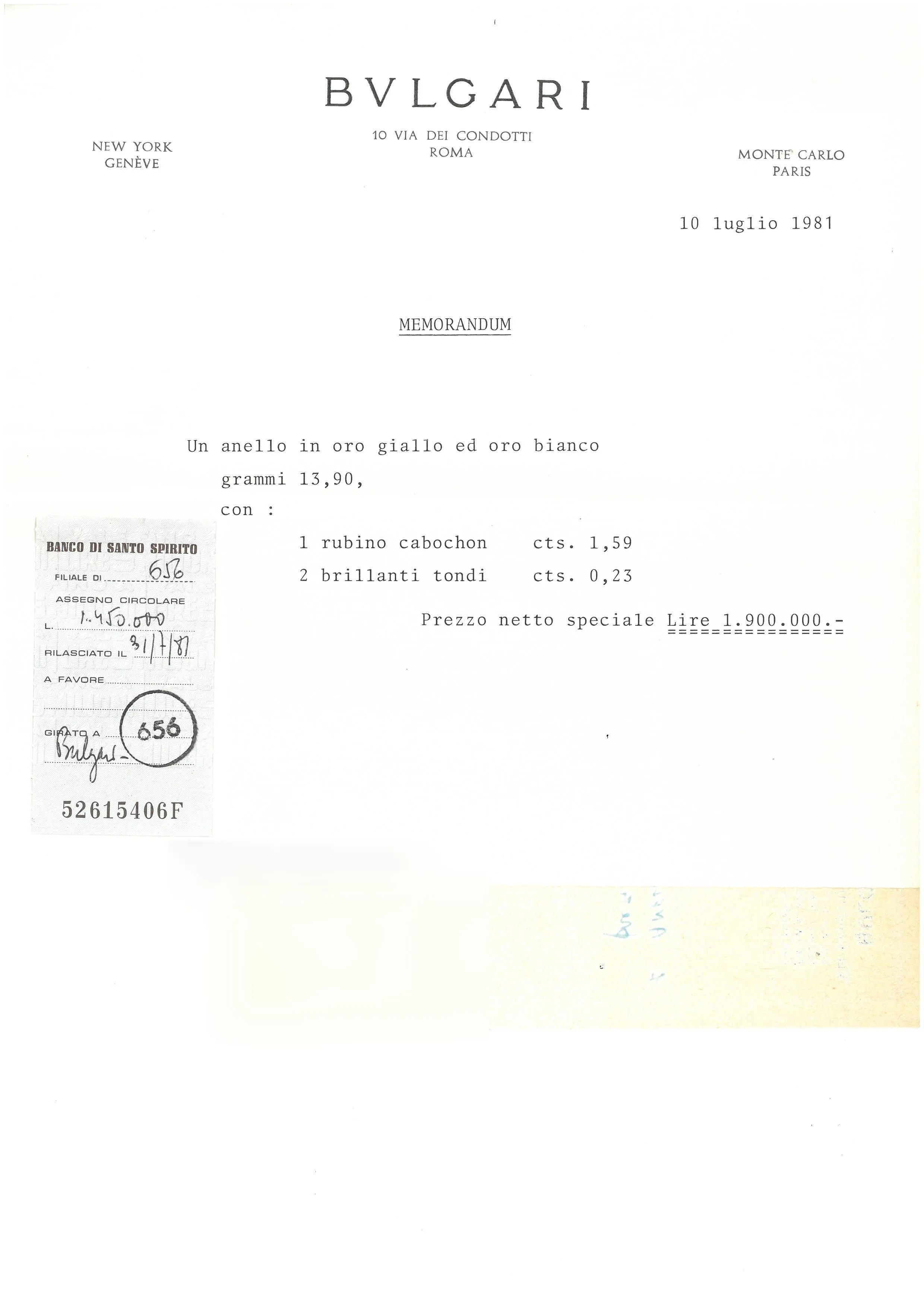 in oro giallo e bianco 18kt, impreziosito da un rubino taglio cabochon di ct 1.60 circa e due diamanti taglio brillante per ct 0.20 circa, firmato Bulgari, punzoni 750 e del fabbricante, mis. 14/54, gr. 14. Corredato di memoradum di acquisto del 10/07/1981.