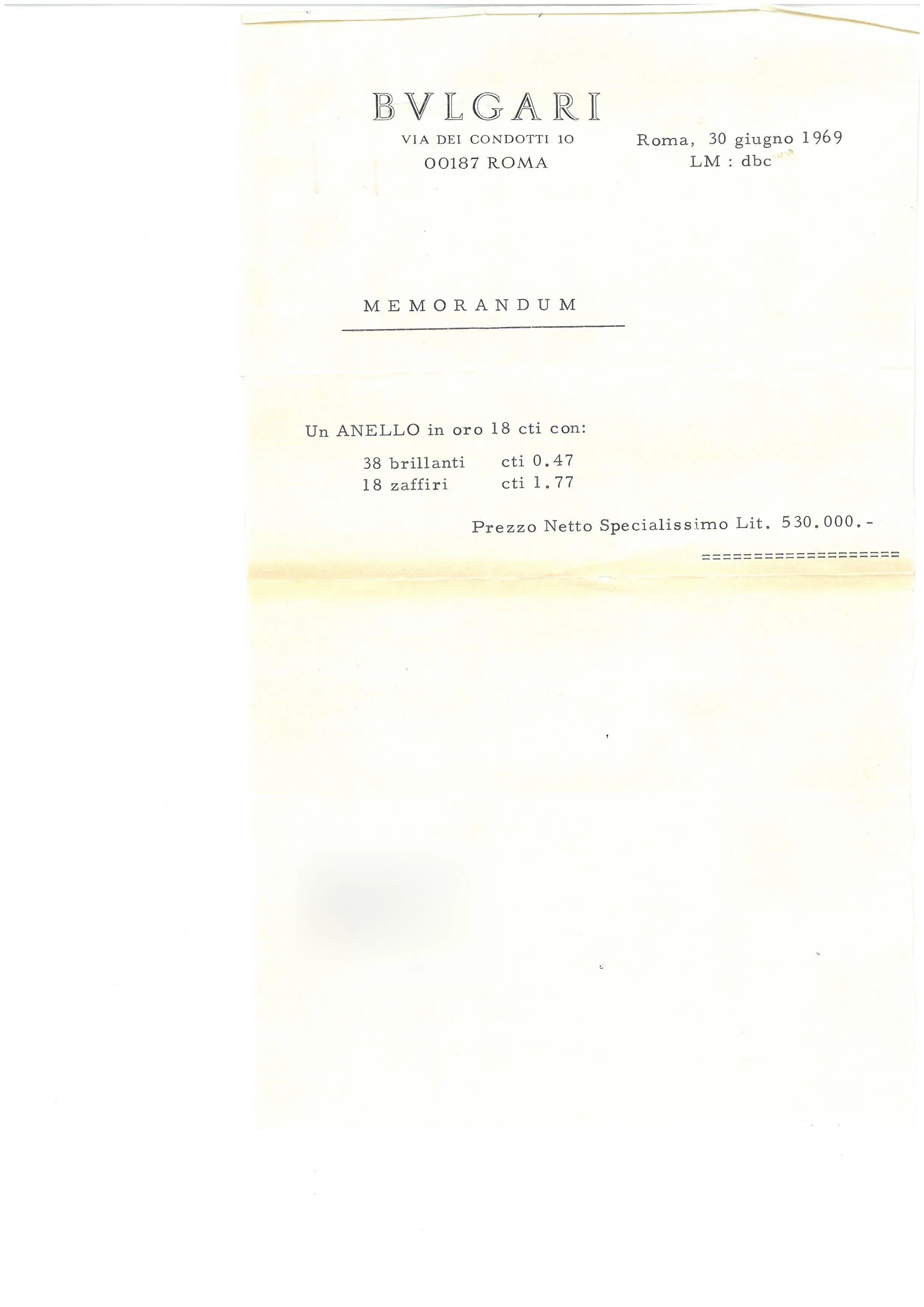in oro giallo 18kt, impreziosito da zaffiri taglio rotondo per ct 1.70 circa e diamanti taglio brillante per ct 0.50 circa, firmato Bulgari, mis. 11/51, gr. 8. Corredato di memorandum di acquisto del 30/06/1969.