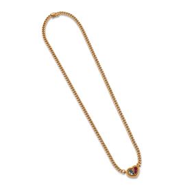 composta da catena groumet in oro giallo 18kt e con centrale a forma di cuore con due pietre semipreziose, firmata Bulgari, punzione 750 e del fabbricante, lungh. 40, gr. 23