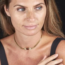 in oro giallo 18kt, impreziosita da un taglio cabochon e diamanti taglio brillante per ct 0.50 circa, firmata Bulgari, lungh. cm 38, gr. 37. Corredata di memorandum di acquisto del 29/12/1978.