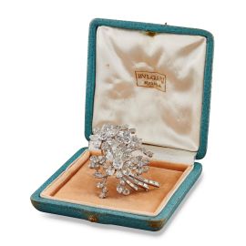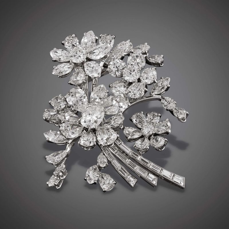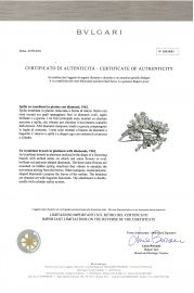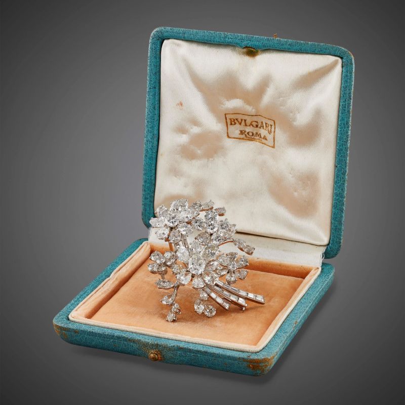 in platino, impreziosita da diamante taglio ovale di ct. 1 circa, diamanti taglio a goccia per ct. 5.20 circa, taglio navette per ct. 2.70 circa, taglio brillante per ct. 2.40 circa, taglio baguette per ct. 1.60 circa, firmato Bulgari, dim. cm 5.5x5, gr. 30. Corredata di scatola e di Certificato di autenticità rilasciato da Bulgari il 2/3/2021.