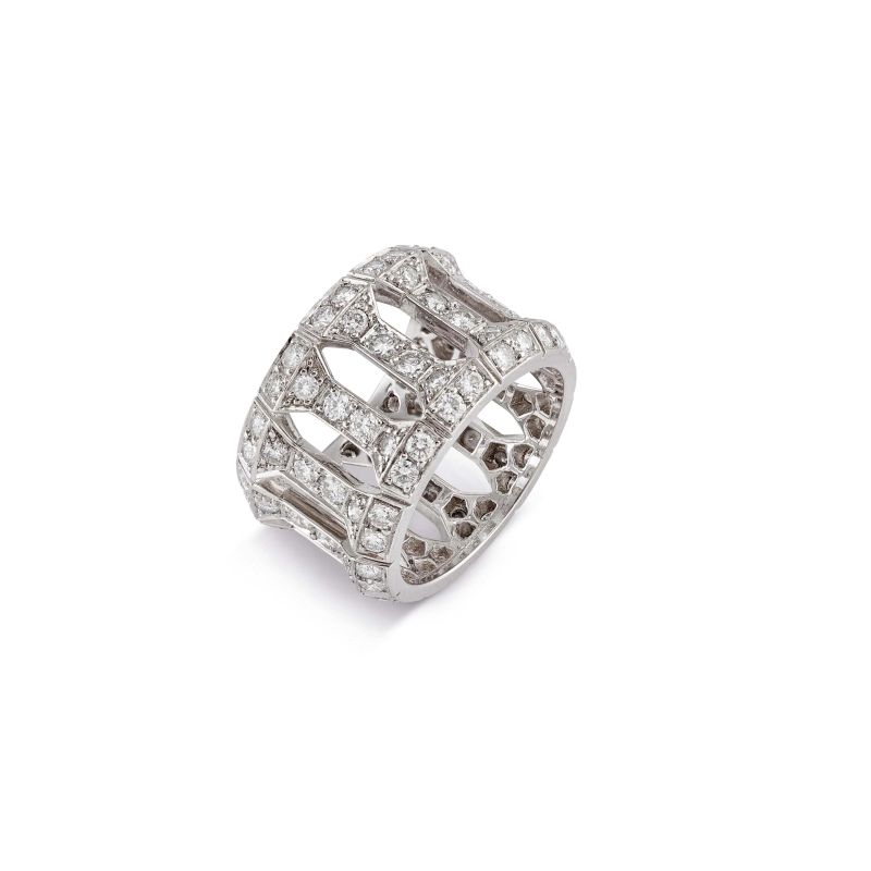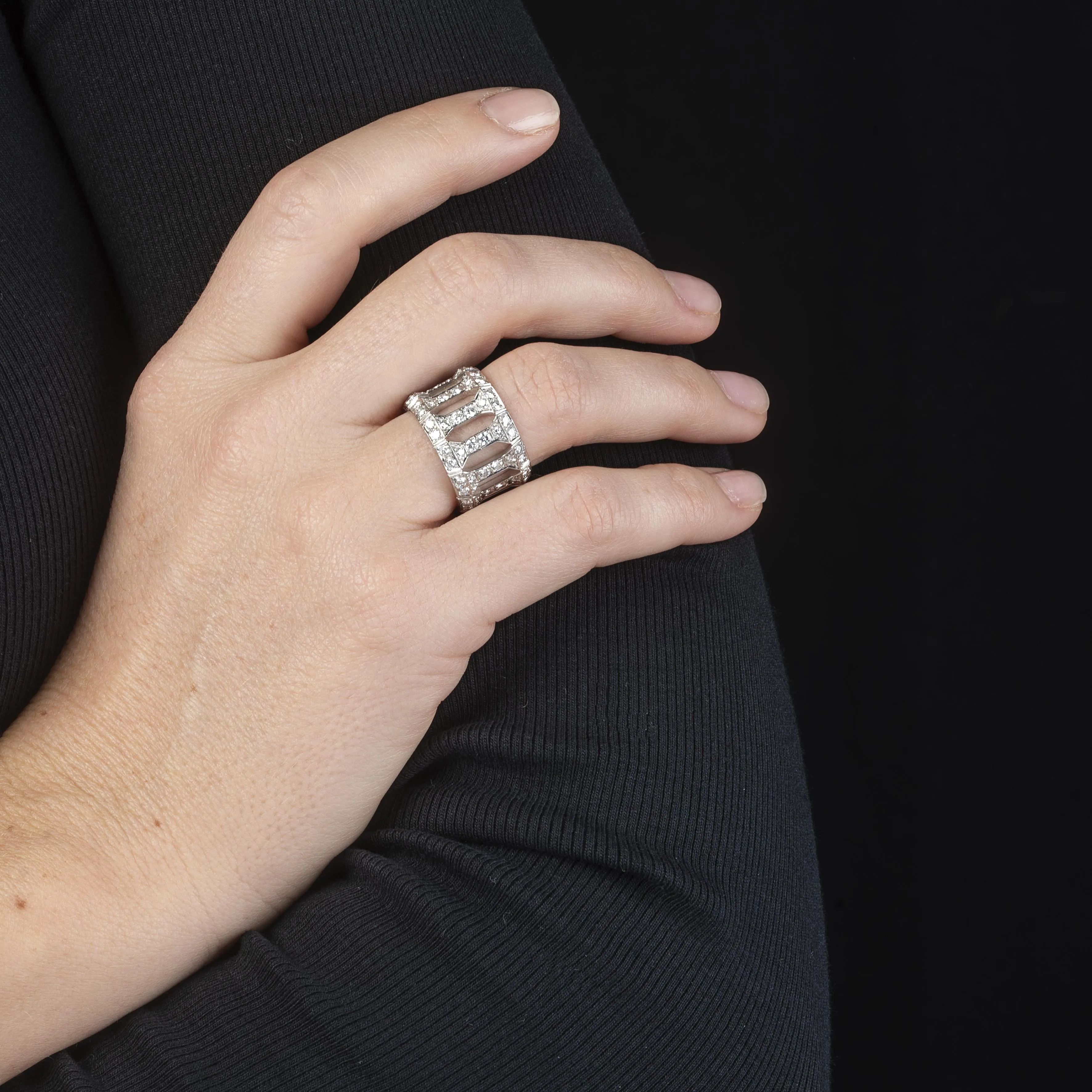 in oro bianco 18 kt, composto da una serie di motivi a colonna con diamanti taglio brillante per ct. 3 circa, firmato Cartier, punzone francese 750 e del fabbricante, mis. 15/55, gr.12. Corredato da scatola.