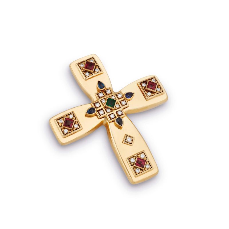 CARTIER CROSS-SHAPED BROOCH WITH DIAMONDS AND GEMSTONES