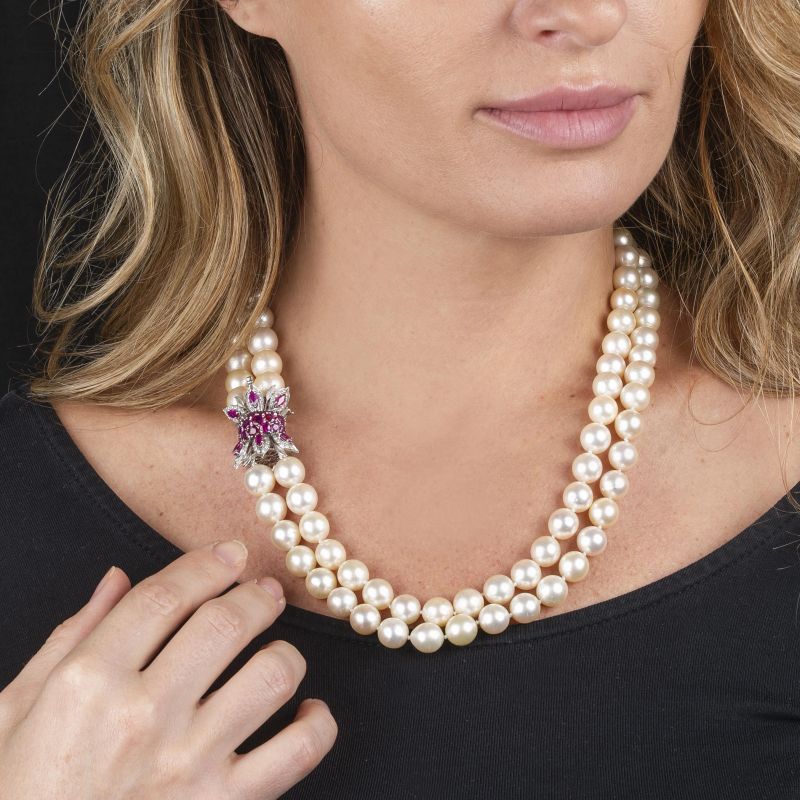 realizzata a due fili di perle South Sea di mm 10 circa, fermatura in platino impreziosita da rubini taglio navette e rotondi per ct 0.50 circa (alcuni scheggiati), con diamanti taglio huit huit per ct. 2.50 circa, lungh. cm 51 circa, gr. 154