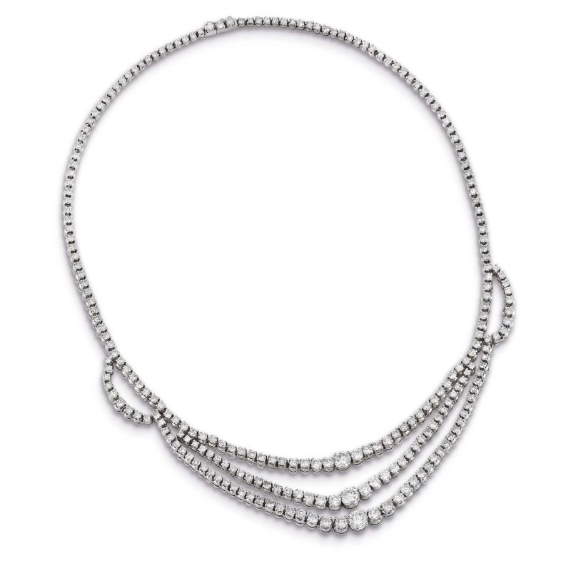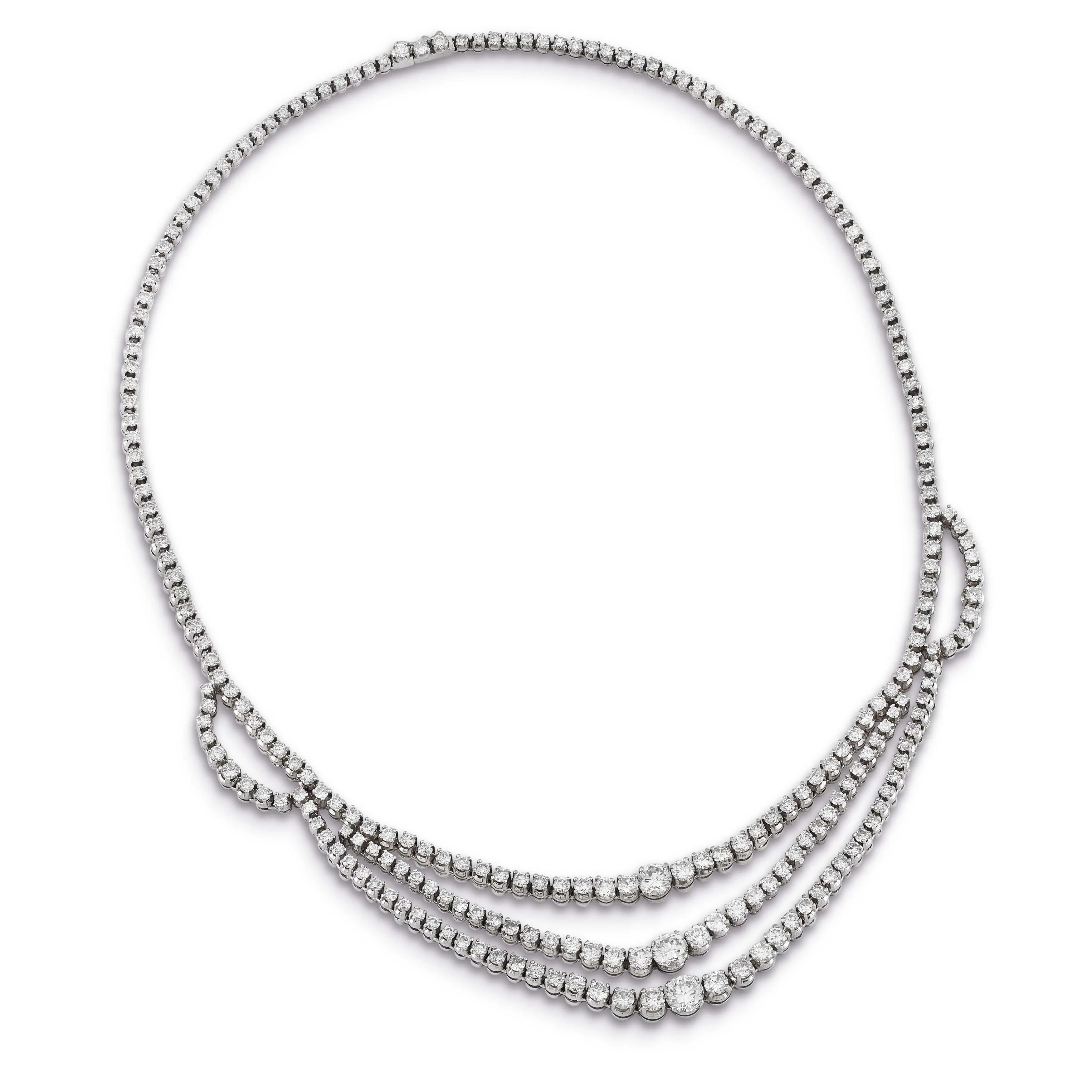 in oro bianco 18kt, impreziosita da tre fili di diamanti taglio brillante per ct 9.40 circa, lungh. cm 41, gr. 35