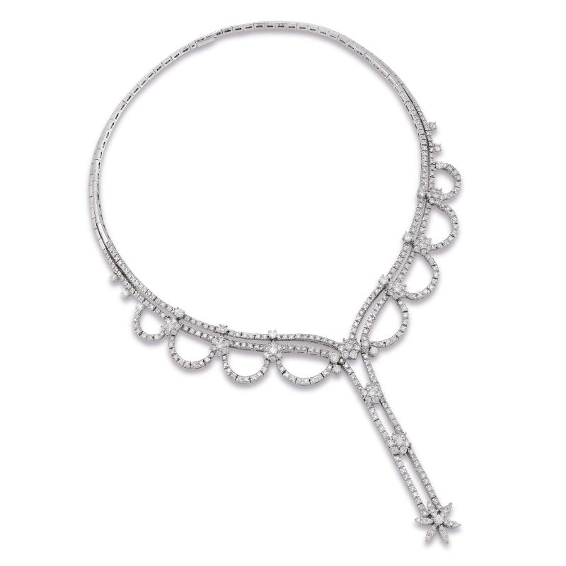 in oro bianco 18kt, composto da due file di diamanti intervallate da fiori formati da diamanti. Peso totale diamanti taglio brillante ct. 9 circa, punzoni 750 e del fabbricante, lungh. cm 55 circa, gr. 63 circa