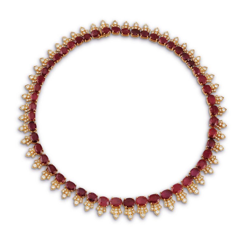 in oro giallo 18kt, impreziosito da rubini digradanti per ct. 35 circa e da diamanti taglio brillante per ct. 5 circa, punzone 750, cm 41, gr. 60
