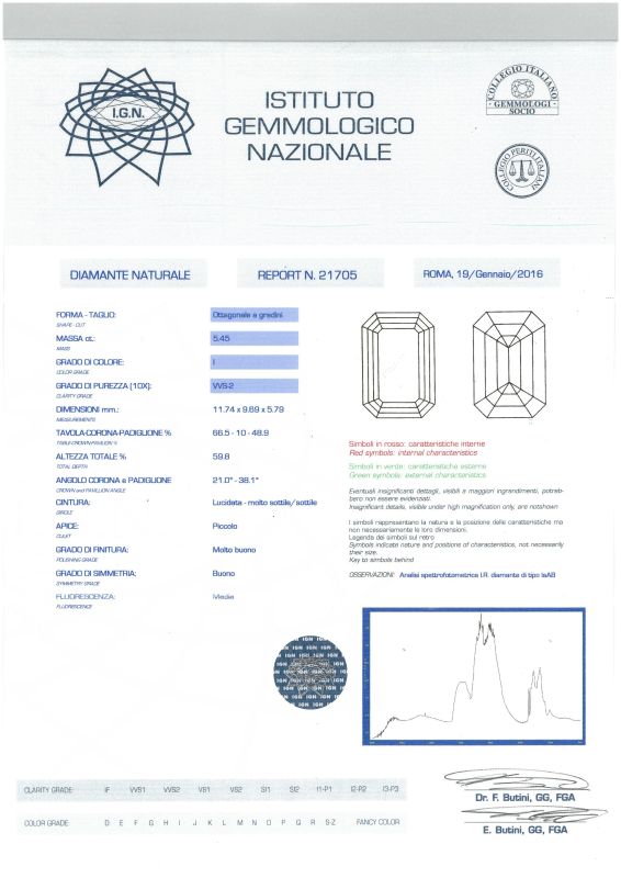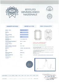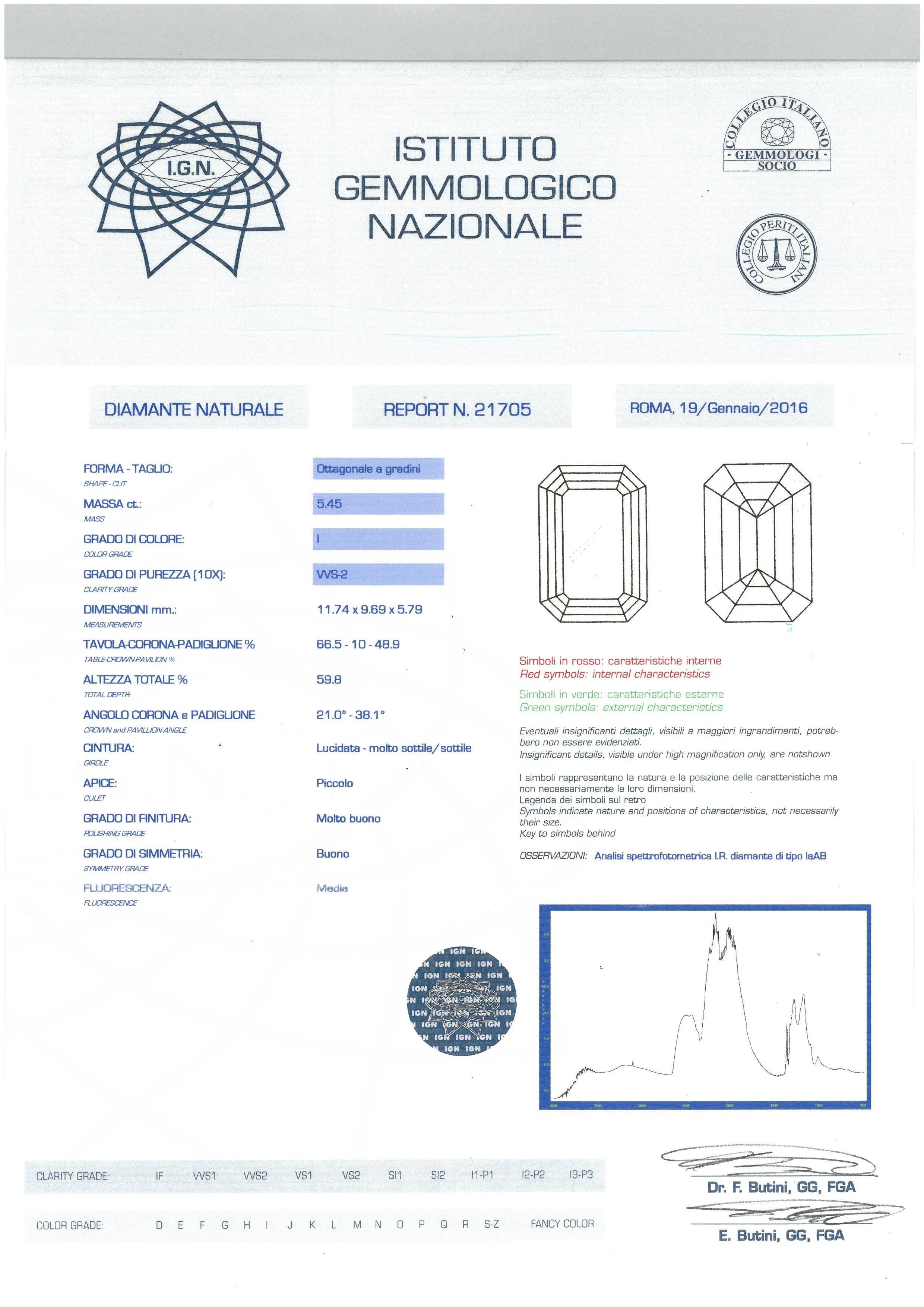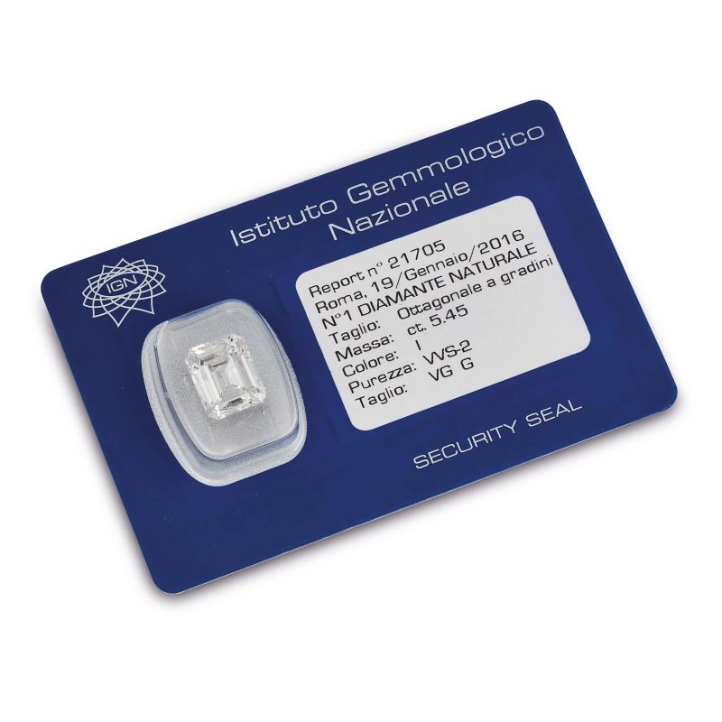 taglio ottagonale, di ct. 5.45, colore I, purezza Vvs2. Corredato di certificato IGN del 19/01/2025 attestante le caratteristiche.