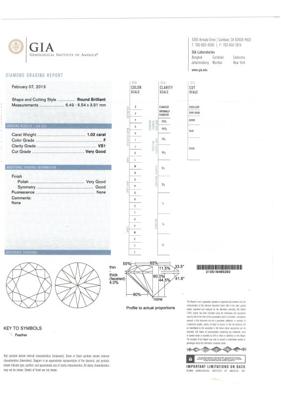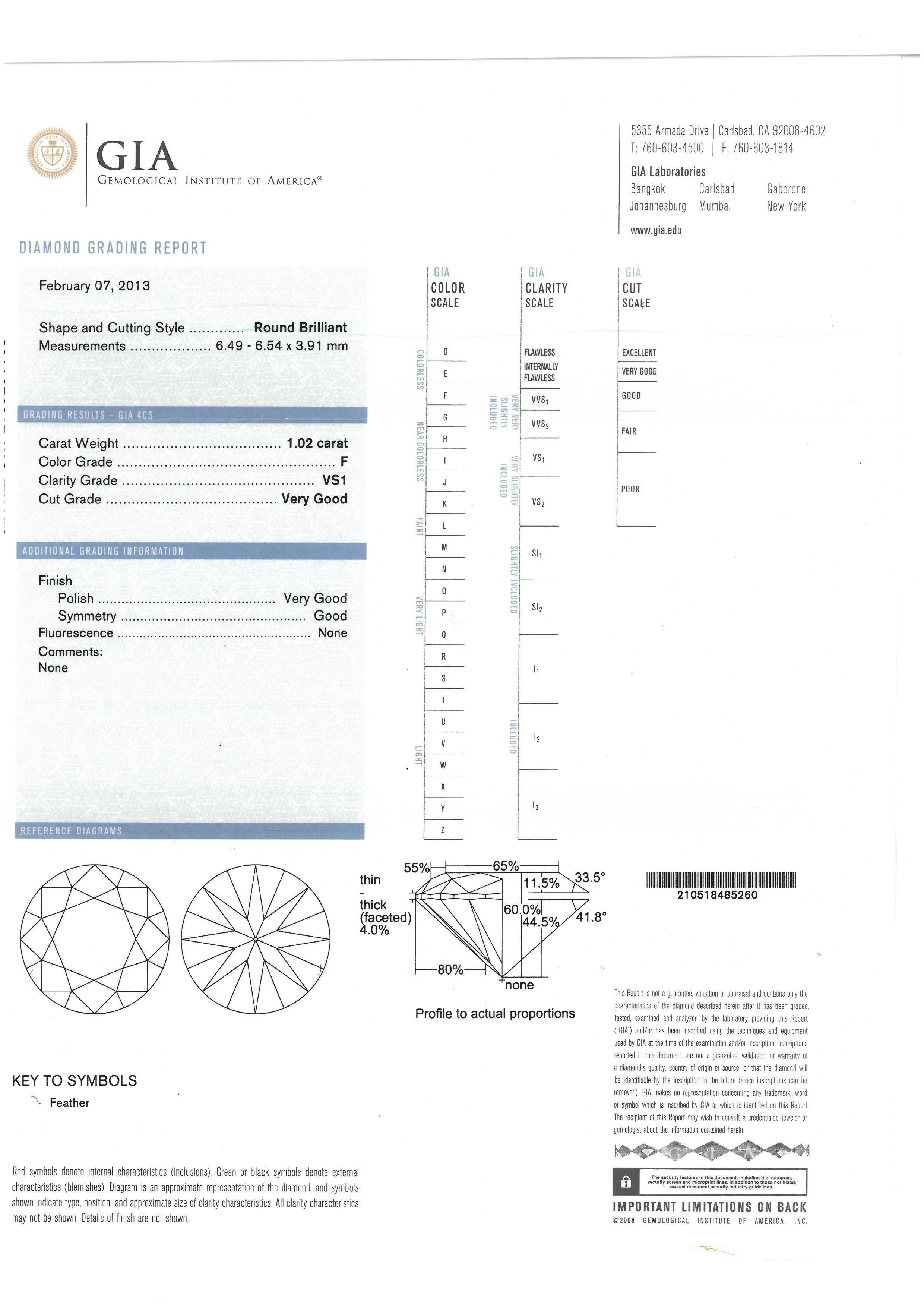 di ct. 1.02, colore F, purezza Vs1. Corredato di certificato GIA del 7/2/2013 attestante le caratteristiche.