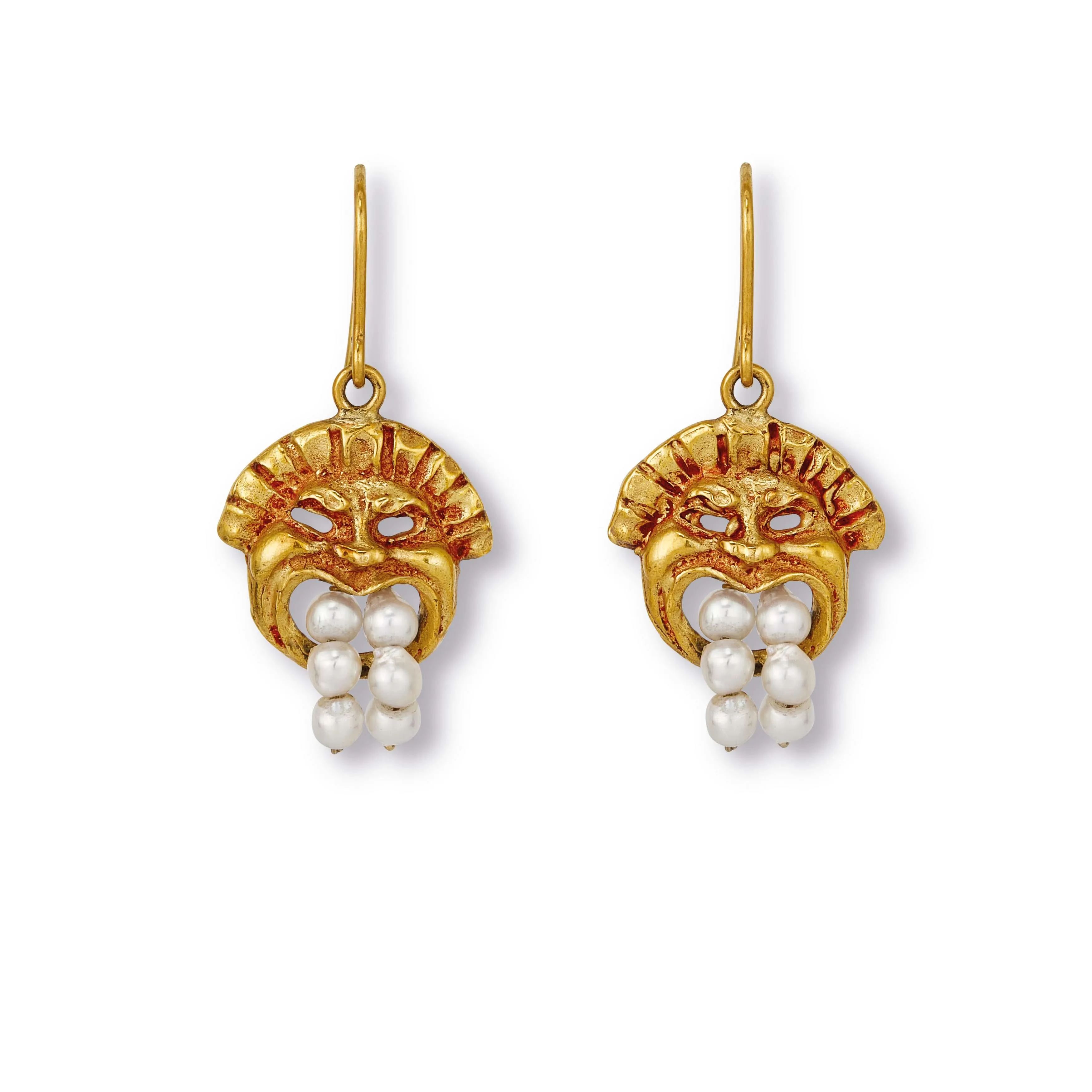 in oro giallo 18kt, composti da una maschera da cui pendono sei perline, chiusura a monachella, firmato Germano, punzone 750 e del fabbricante, dim. cm 3.7x 1.9, gr. 9