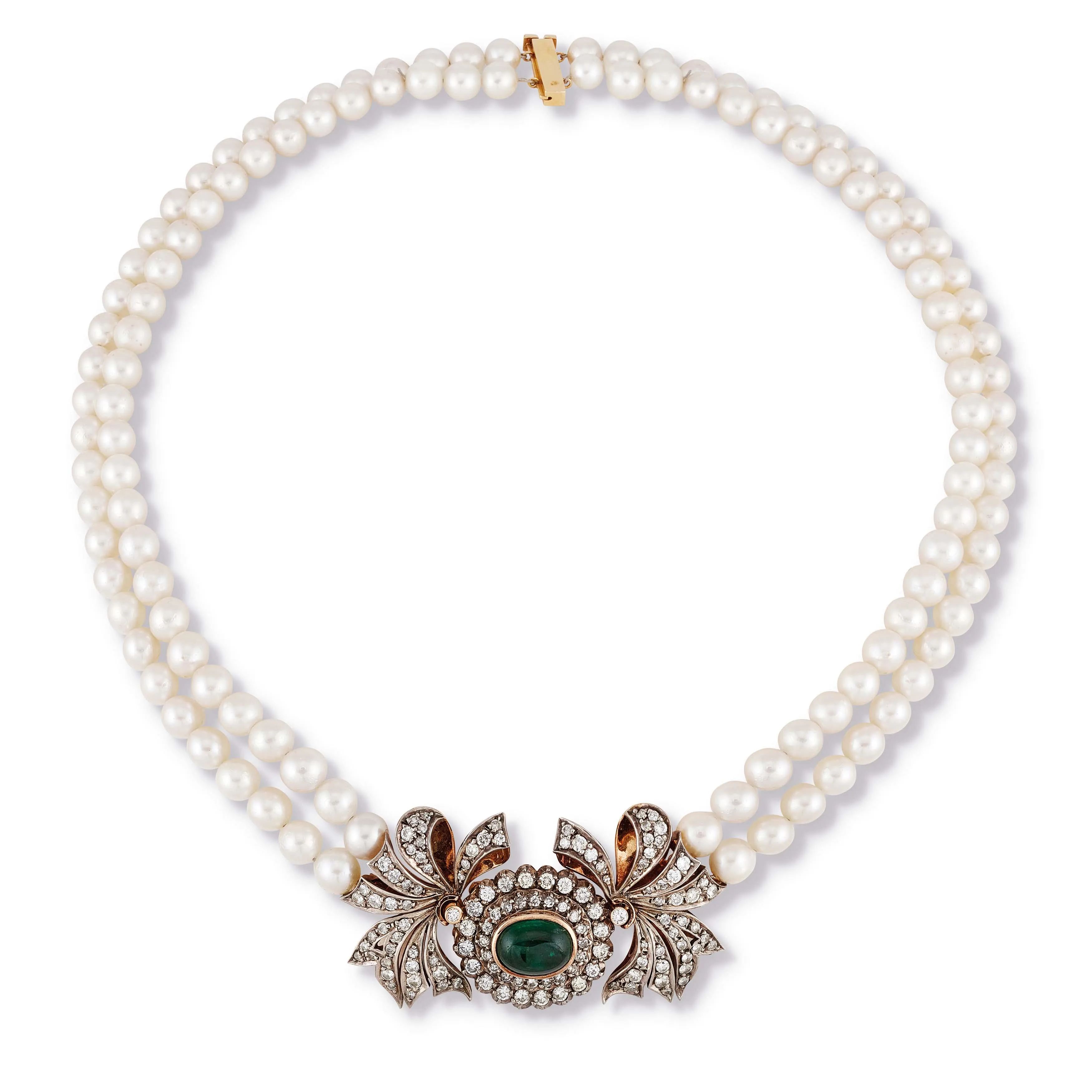 realizzata a due file di perle digradanti di mm 8-7, fermatura in oro giallo e argento, impreziosita al centro da uno smeraldo taglio cabochon di ct. 6.50 circa e con diamanti taglio brillante per ct 5.50 circa complessivi, punzoni 750 e del fabbricante, lungh. cm 49, gr.108. Corredato di scatola