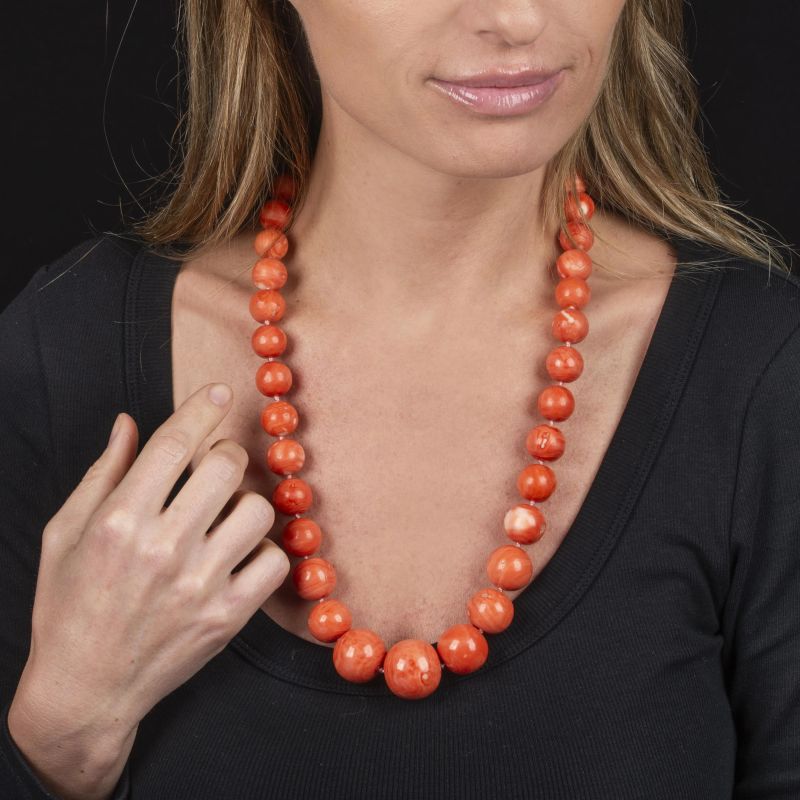 realizzata ad un filo di boules in corallo digradanti di mm 24-12 circa, chiusura in oro giallo 18kt, lungh. cm 65, gr. 252