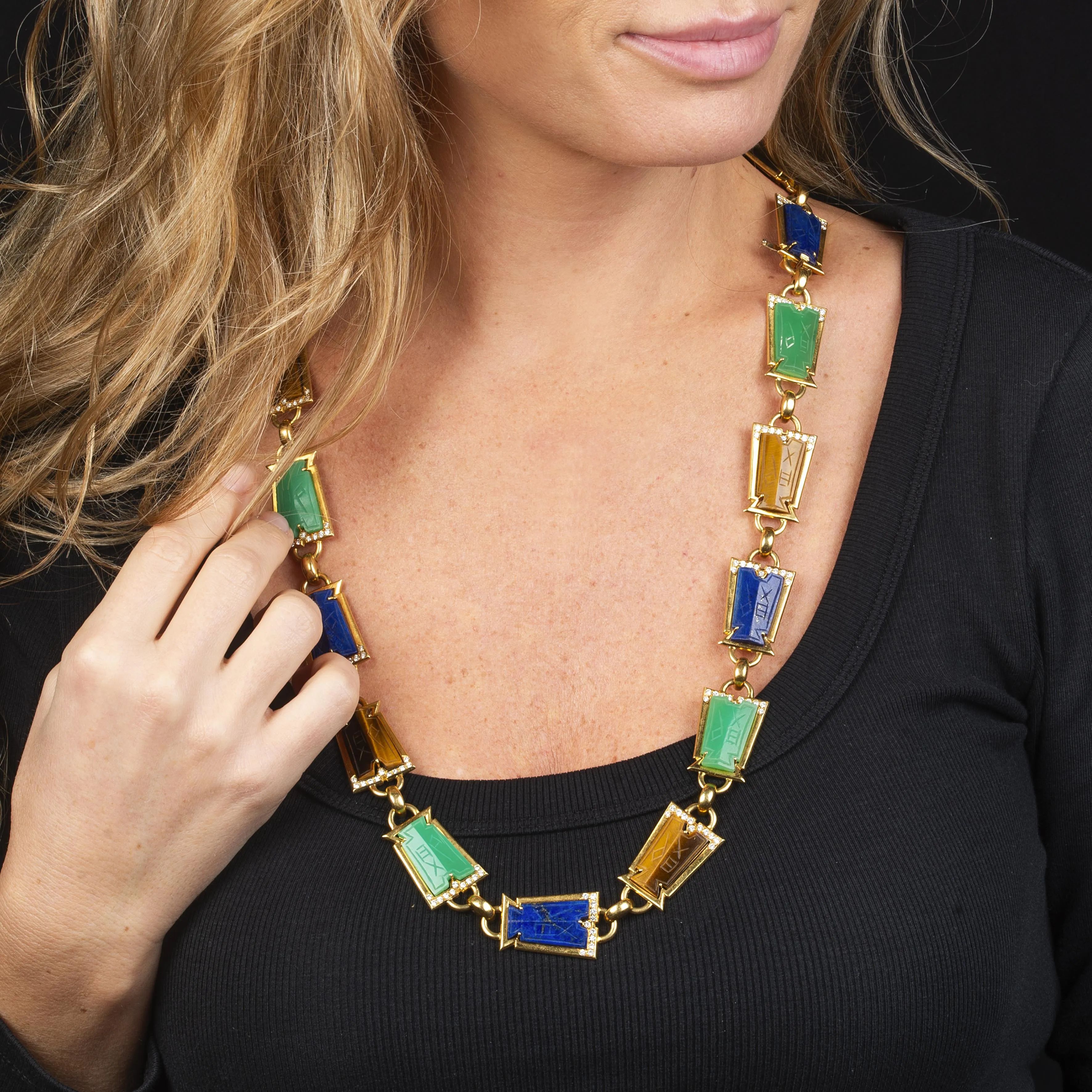 in oro 18kt, composta da una serie di maglie a forma geometrica impreziosite da pietre dure incise con ideogrammi, in giada, lapislazzuli, occhio di tigre, diamanti taglio brillante per ct 5 circa, firmato Massoni, punzone 750, lungh. 79.5, gr. 213