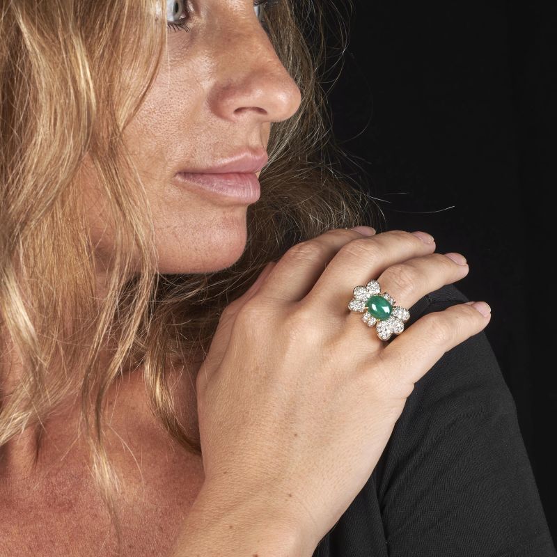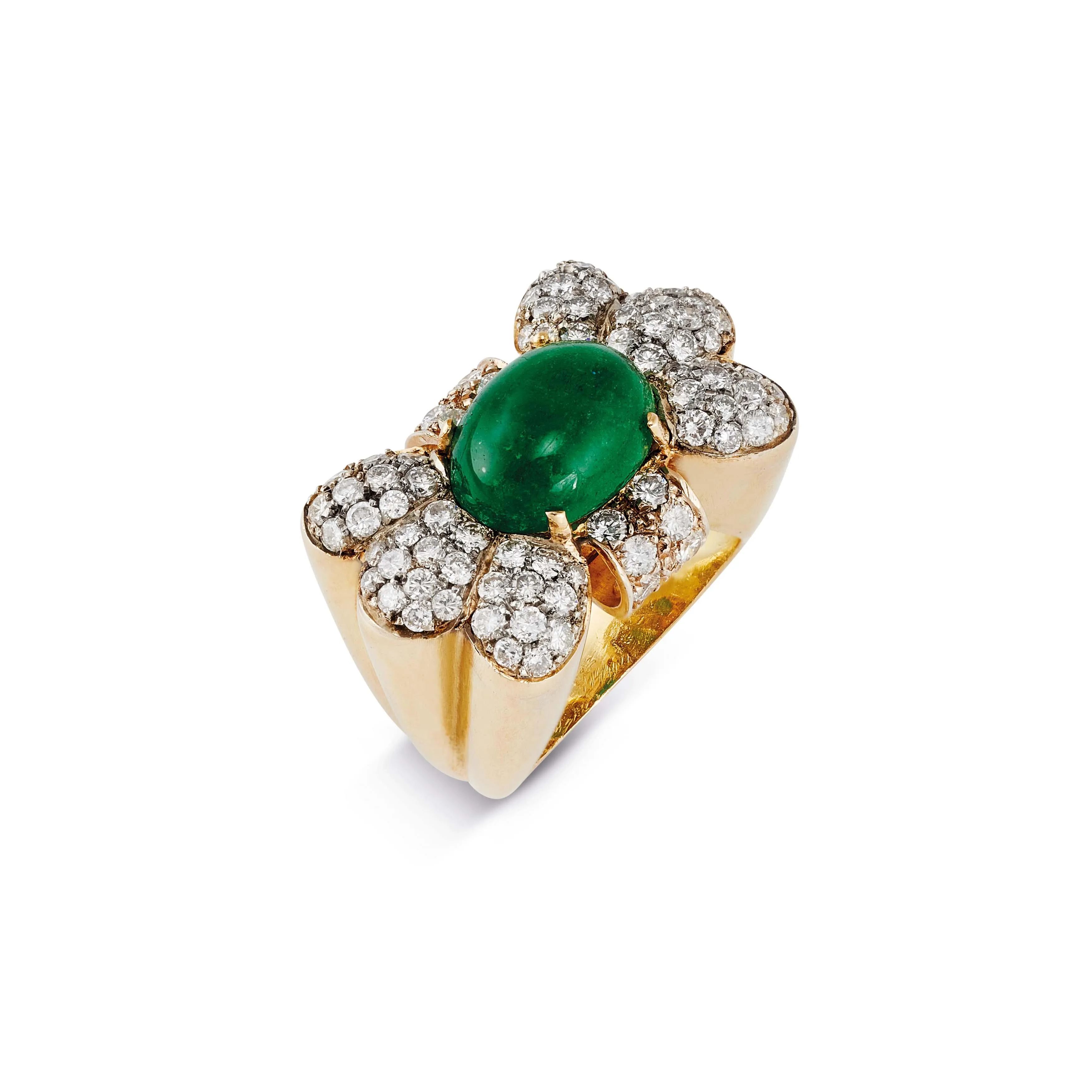 in oro giallo 18kt, impreziosito da uno smeraldo taglio cabochon di ct 3.80 circa, circondato da diamanti taglio brillante per ct 1.70 circa, firmato Moroni, punzoni 750 e del fabbricante, mis. 12/52, gr. 20