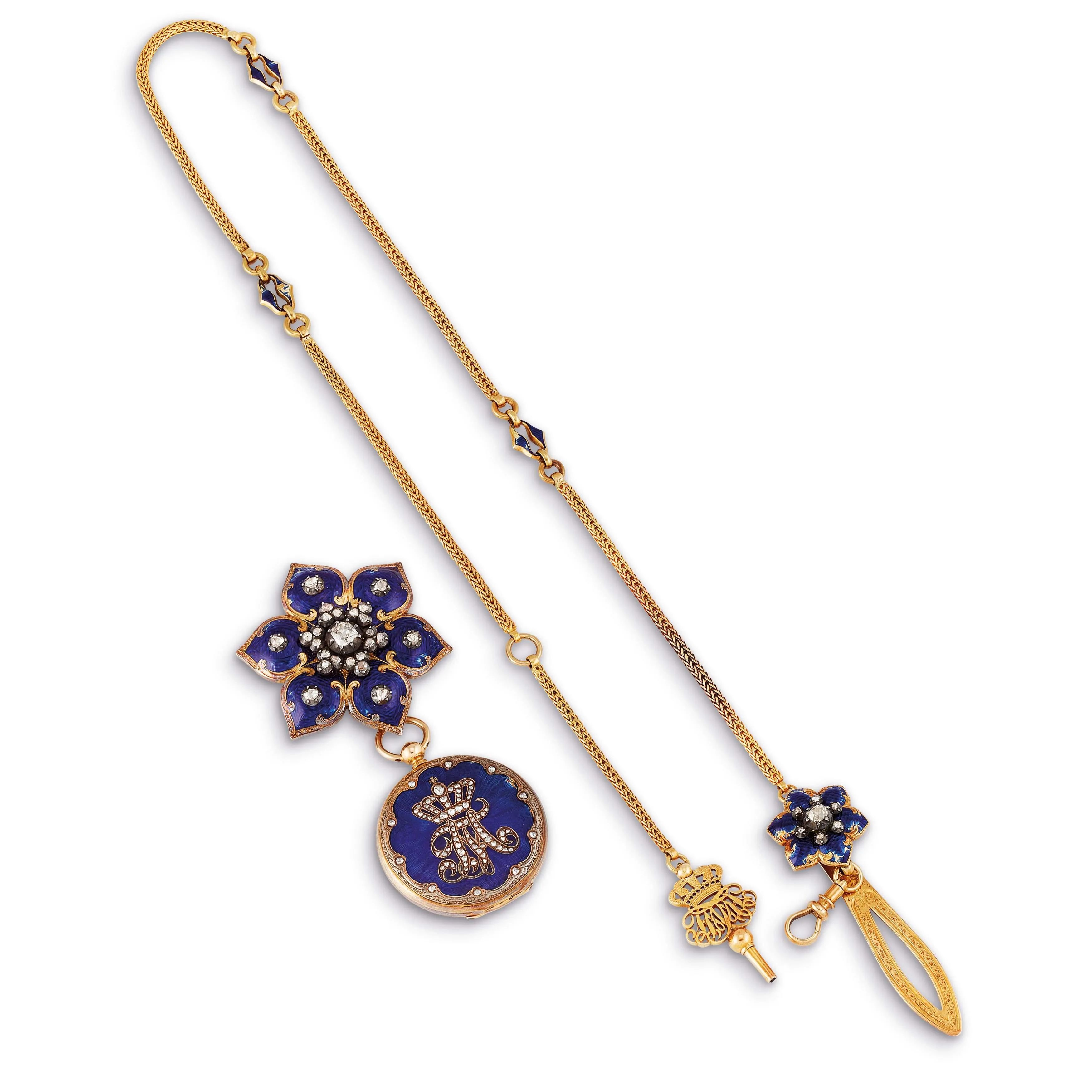 cassa in due parti in oro giallo 18kt, con stemma centrale, decorata in smalto blu (difetti), numeri romani, carica a chiavetta, gr. 21, dim. cm 3x4,5. Corredato di spilla in oro giallo 18kt, realizzata a forma di fiore con superficie smaltata, diamanti taglio antico e a rosa per ct. 1 circa, dim. 3.7x 3.9, gr. 14 e catena in metallo con elementi smaltati, lungh. cm 49.8
