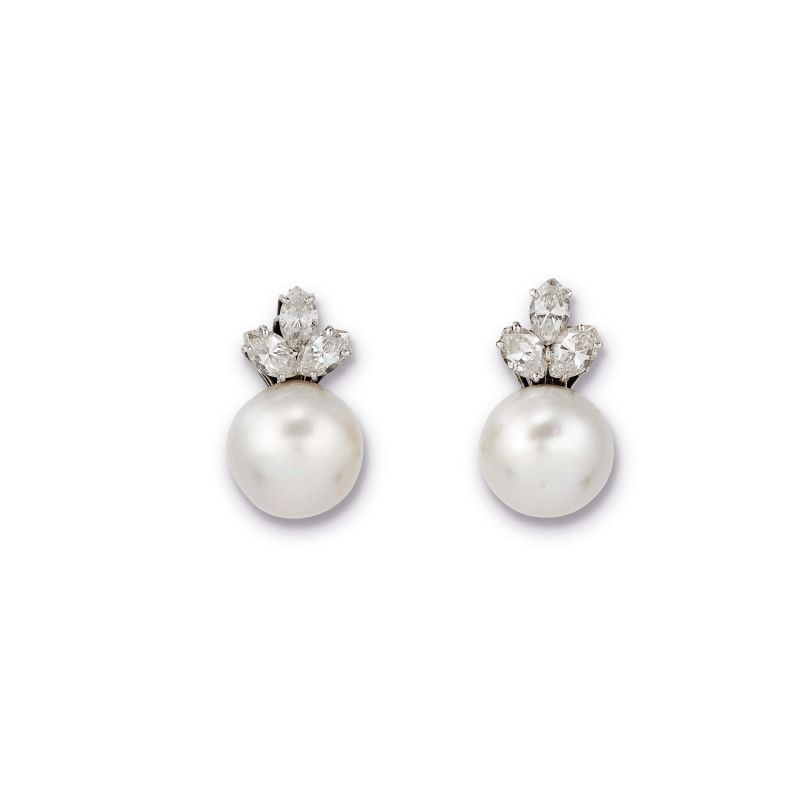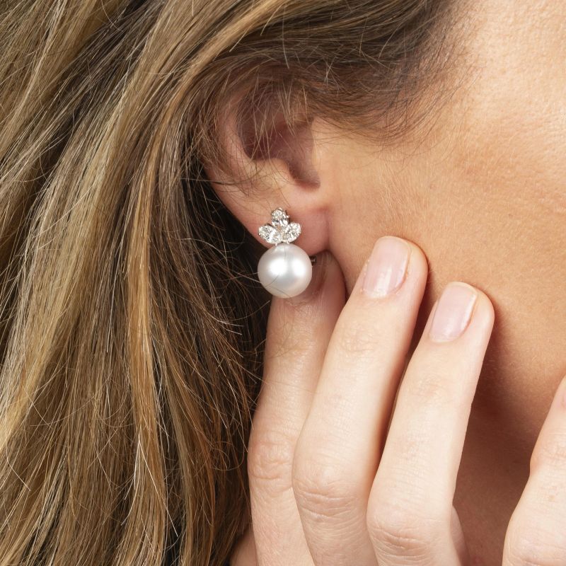 in oro bianco 18 kt, con perle South sea dim. 11x11 circa, diamanti taglio navette per ct. 0.90 circa, chiusura a clip, lung. cm 2, gr. 9