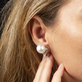 in oro bianco 18kt, con perle South Sea di mm 15x13, circondate da diamanti taglio carrè per ct. 1.50 circa, chiusura a clip, lungh.cm 2.5, gr. 17, punzone 750.