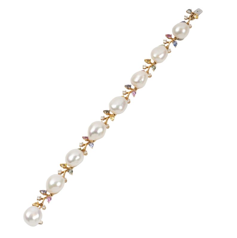 in oro giallo 18kt, composto da una serie concatenata di tralci e perle di acqua dolce, con zaffiri multicolore e diamanti taglio brillante per ct. 0.80 circa, firmato Schoeffel, punzone 750, lungh. cm 19 circa, gr. 30