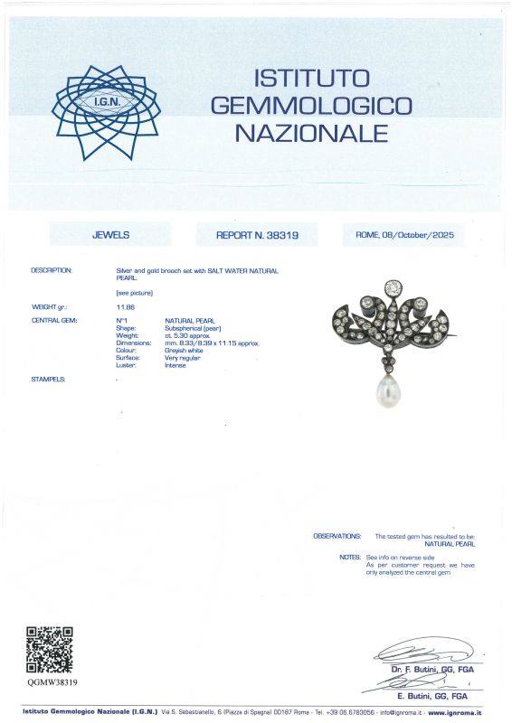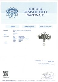 in argento e oro a basso titolo, con diamanti taglio antico per ct. 4.50 circa, perla naturale a goccia, gr. 11 dim. 8x11 circa dim.3.5x4 circa, gr. 11. Corredata di certificato IGN del 8/10/2025.