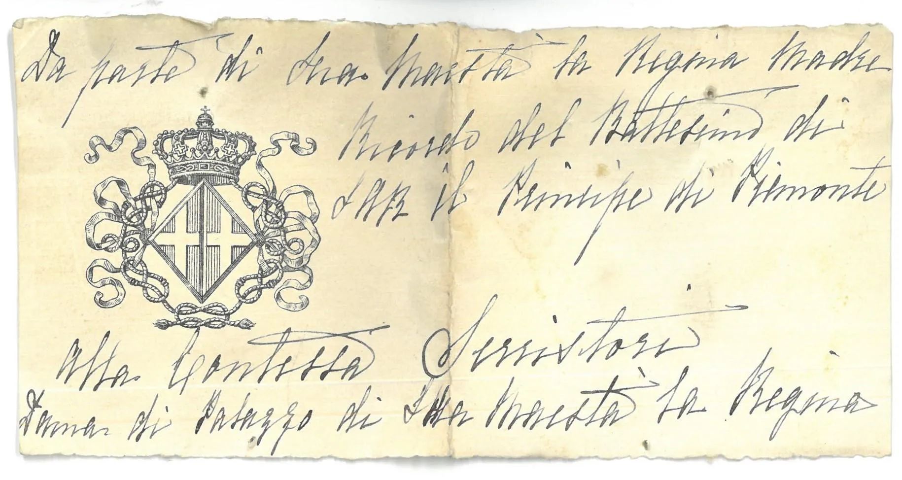 in oro giallo 18kt, composta da una medaglietta centrale incorniciata da nodi Savoia in smalto blu (difetti) raffigurante il busto a rilievo del Principe di Piemonte Umberto II di Savoia, destinato ad essere l'ultimo Re d'Italia. Sul retro reca l'incisione "Racconigi Settembre 1904 Decembre Roma", firmata M. Lancelot Croce, dim. cm 4x3,5, gr. 21. Corredata di cartiglio con dedica alla Contessa Serristori, Dama di Palazzo di Sua Maestà La Regina Madre Maria José del Belgio.