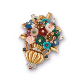 in oro giallo 18kt, impreziosita da diamanti taglio brillante per ct. 0,50 circa, perle, rubini, zaffiri, smeraldi e pietre dure incise, punzone 750 e del fabbricante, dim. cm 5x4, gr. 26