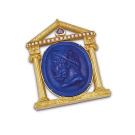 in oro giallo 18kt, raffigurante un volto di uomo classico a rilievo su pasta, il fregio impreziosito da diamanti taglio brillante per ct. 0.80 circa, con zaffiro rosa taglio al cuore di ct. 0.75 circa, dim. 6x6.9 circa, gr. 54