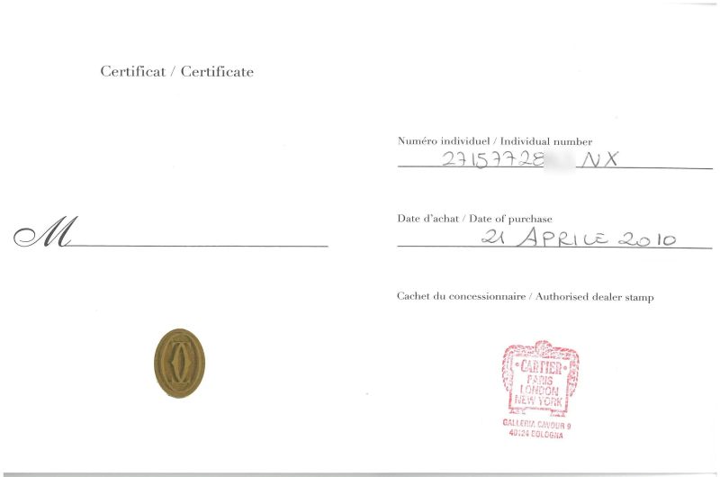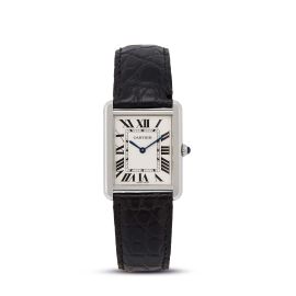 cassa di forma in acciaio, fondello serrato con viti, corona con pietra cabochon blu, quadrante argenté, grafica nera, numeri romani a smalto, movimento al quarzo, cinturino originale in pelle nera, lungh. interna cm 21 circa, fibbia deployant in acciaio marcata Cartier, vetro minerale. Dim. mm 27x35. Corredato di scatola, libretto, garanzia e cd.