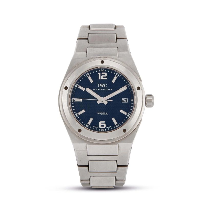 cassa in acciaio, fondello serrato a vite, corona marcata, lunetta a scalino con fori, quadrante nero guillochè, grafica bianca, indici e numeri arabi applicati, datario a ore tre, movimento a carica automatica cal C 80110 n. 2625638, bracciale a maglie in acciaio, lungh. interna cm 20 circa, chiusura deployant in acciaio marcata IWC, vetro minerale. Diam. mm 42. Corredato di scatola, garanzia, libretti e secondo cinturino in pelle plastificata di colore nero con fibbia deployant in acciaio originale.
